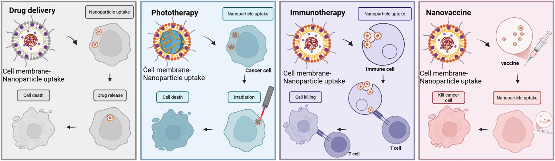Figure 4. Anticancer applications of cell membrane-encapsulated nanoparticles. In cancer drug delivery, coatings derived from erythrocyte and cancer cell membranes enhance therapeutic efficacy by prolonging circulation and enabling targeted localization to tumors. Similarly, in phototherapy applications, cell membrane-encapsulated nanoparticles serve as excellent carriers for targeted delivery of photothermophiles and photosensitizers to tumors, thereby enhancing their effects under irradiation. In immunotherapy, cell membrane-encapsulated nanoparticles can deliver immunostimulants, either as a source of antigen or in direct contact with immune cells, to promote antitumor immunity. Taking advantage of their nanoscale size, nanovaccines have shown remarkable results against tumor cells. They play a unique role through efficient antigen delivery, precise targeting of tumor cells, and activation of a broad immune response.