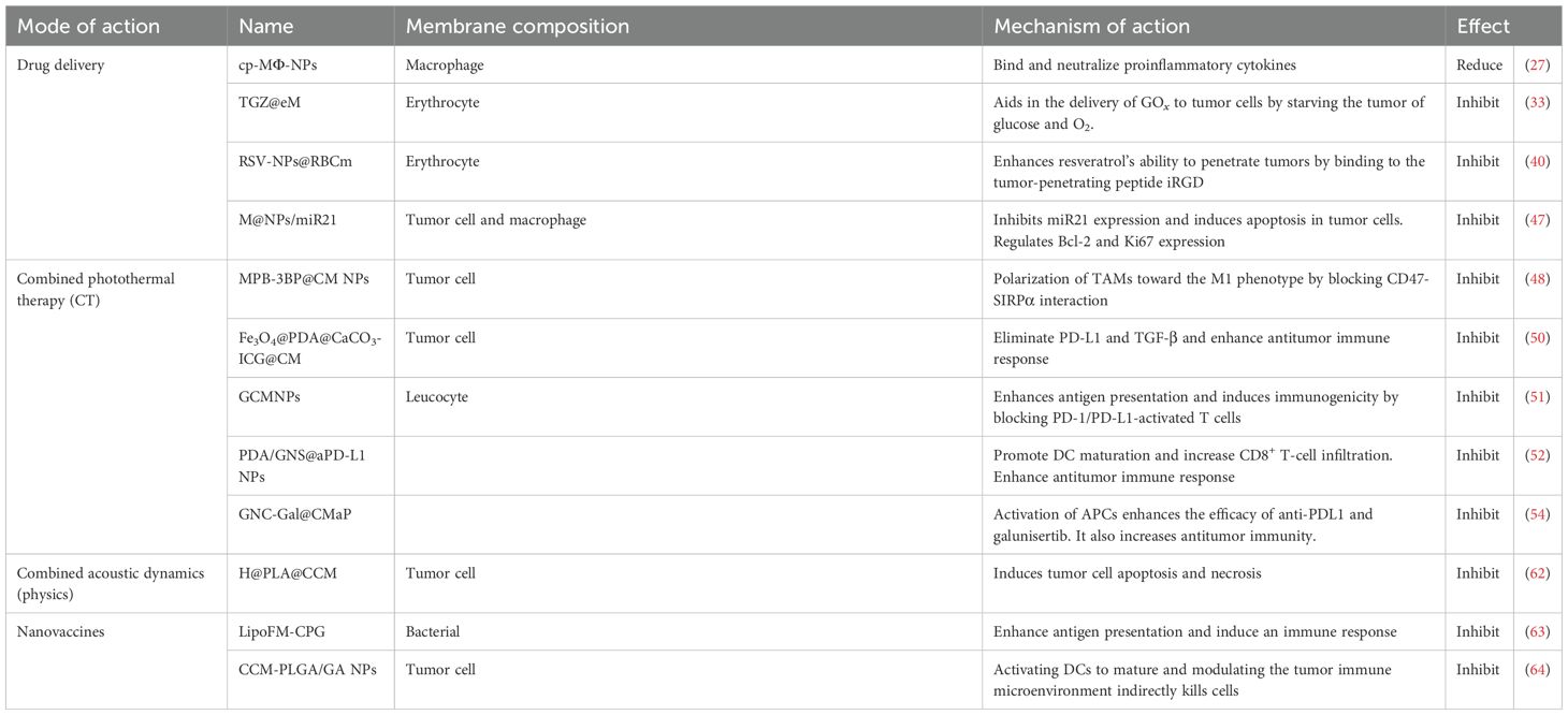 Cancer cell membrane-encapsulated nanoparticles show potential for multifaceted applications in the field of tumor therapy. By co-loading photosensitizers and Toll-like receptor 7 agonists, they are able to enhance the efficacy of combined tumor immunotherapy by generating reactive oxygen species (ROS) to kill tumor cells in combination with photodynamic therapy and activating the host’s antitumor immune response to remove residual tumor cells (21). In addition, these nanoparticles enhance the bioavailability of poorly water-soluble drugs, increase selective drug accumulation in tumors, and improve therapeutic efficacy while reducing systemic toxicity (22). They also incorporate inducers of immunogenic cell death (ICD), enhance ICD in tumor cells, facilitate the release of tumor-associated antigens and damage-associated molecular patterns, thereby stimulating antitumor immune responses (23). In the construction of tumor vaccines, these nanoparticles enhance the maturation and activation of dendritic cells to stimulate specific antitumor immune responses and efficiently target and stimulate the maturation of DCs by modifying the TLR9 agonist, CpG oligonucleotides, and aptamers on tumor cell membrane vesicles to generate long-lasting antitumor immune responses (24).