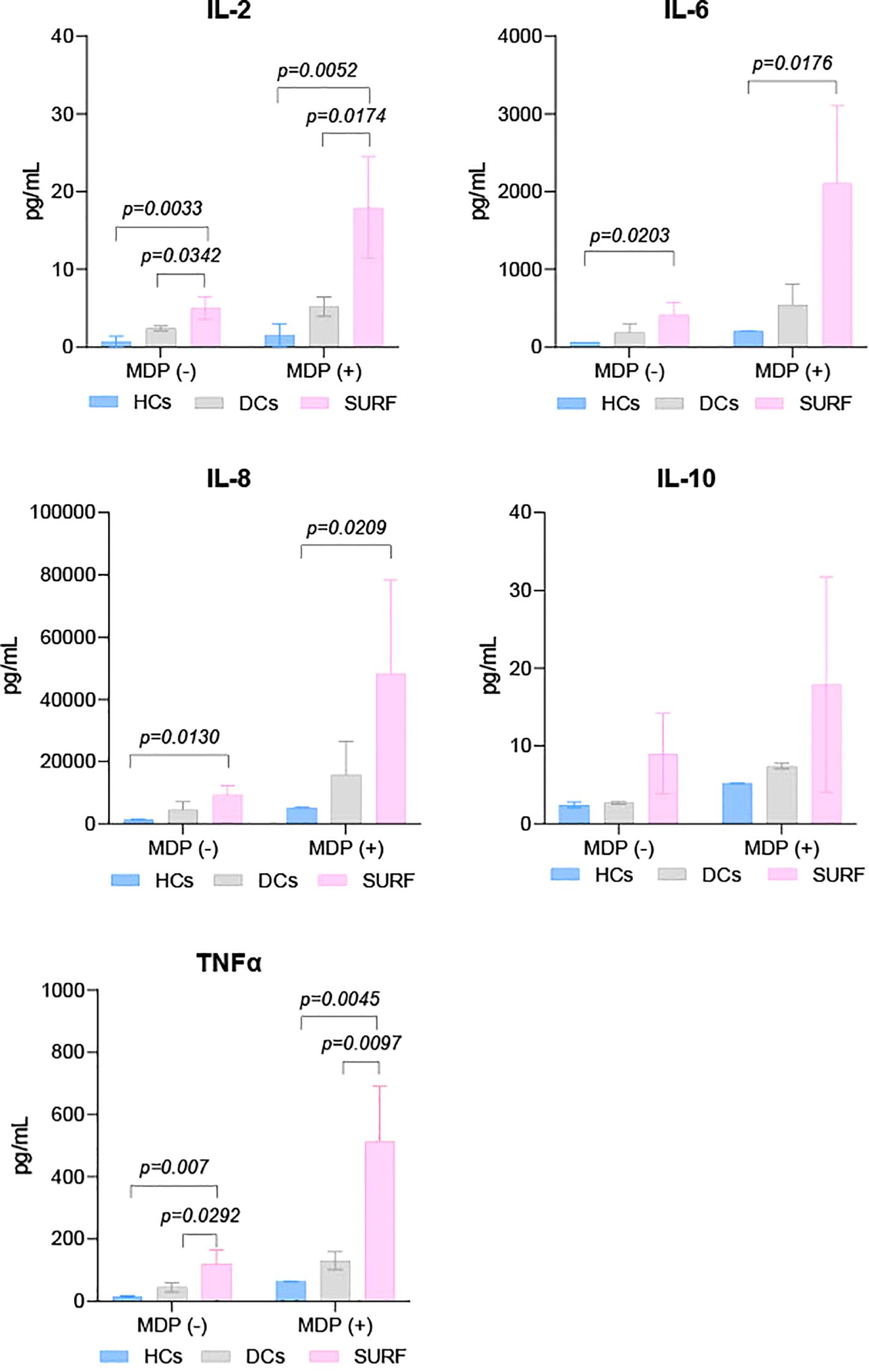 Baseline and MDP-stimulated cytokine concentrations (TNF-α, IL-2, IL-8, IFN-γ, IL-4, IL-6, IL-10, and GM-CSF) were evaluated across SURF patients, healthy controls (HCs), and disease controls (DCs). Cytokine profiles did not differ significantly between HCs and DCs under either unstimulated or MDP-stimulated conditions (Figure 1).