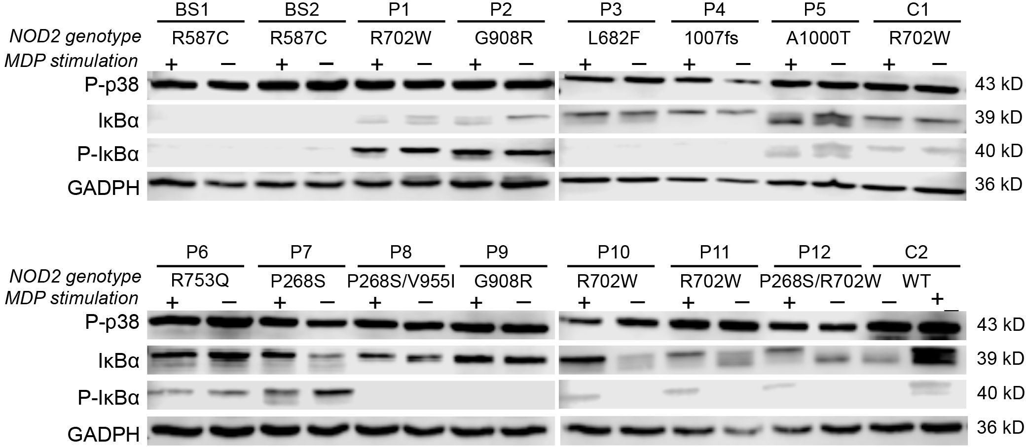 Figure 2. Effects of NOD2 variants on NF-κB and MAPK activation. Western blot analysis of p-p38, IκBα, and p-IκBα proteins at baseline and 24 hours post-MDP stimulation, categorized by NOD2 genotypes. GAPDH was used as a loading control.