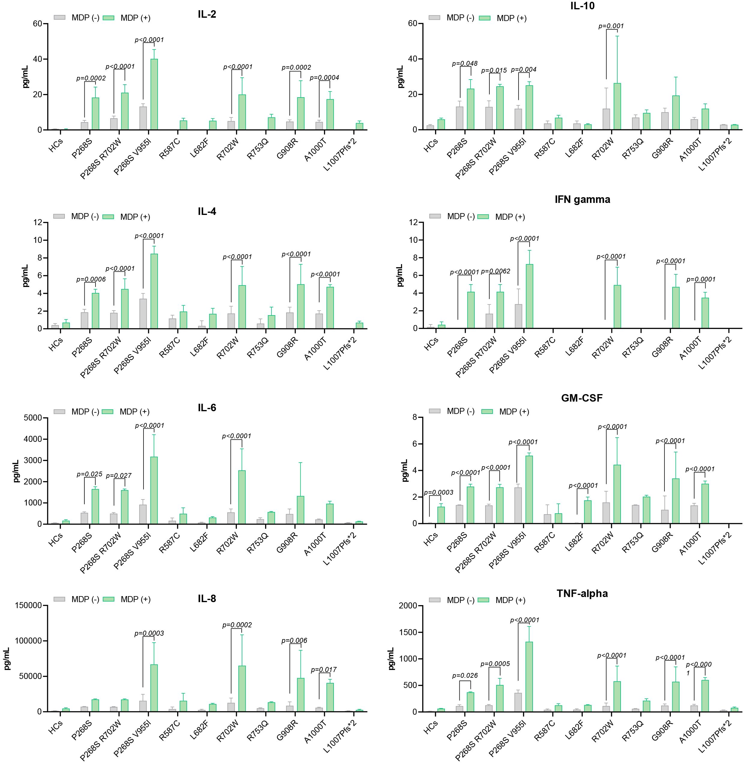 Patients harboring R702W (P1, P10, P11), G908R (P2, P9), P268S/V955I (P8), and R702W/P268S (P12) variants demonstrated the strongest inflammatory profiles, with MDP-stimulated cytokine production significantly higher than that of healthy controls (HCs) (Figures 3, 4). Both the P268S/V955I and R702W variants were associated with elevated levels of all measured cytokines. Similarly, the P268S/R702W and G908R variants induced substantial cytokine responses, though selectively: P268S/R702W did not increase IL-8, and G908R failed to elevate IL-6 and IL-10. This pattern may point to a potent but cytokine-specific inflammatory signature.
