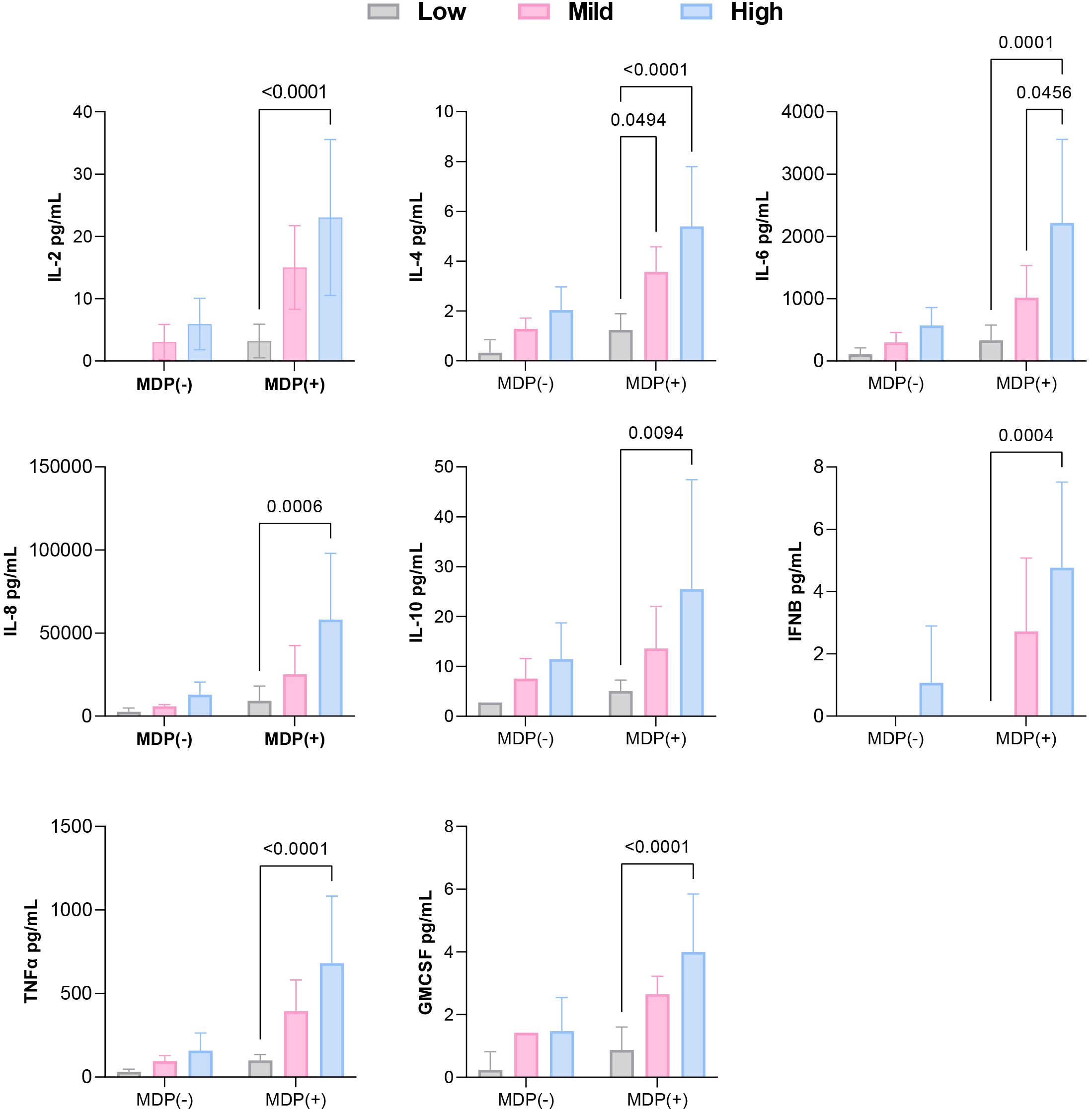Figure 4. Comparison of cytokine levels among low, mild, and high inflammatory profiles, classified based on p-IκBα expression and cytokine production under baseline and post-MDP conditions.