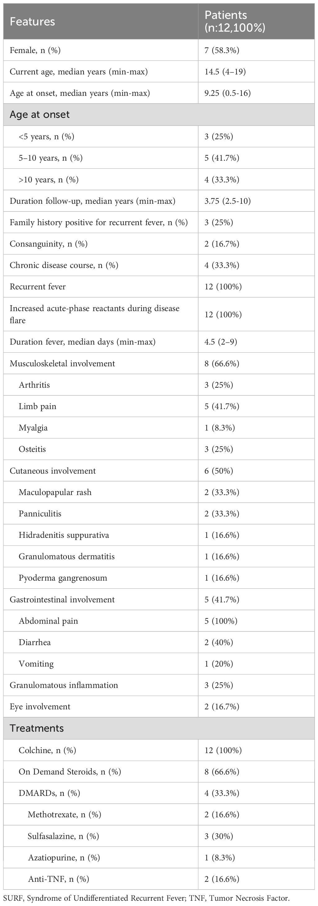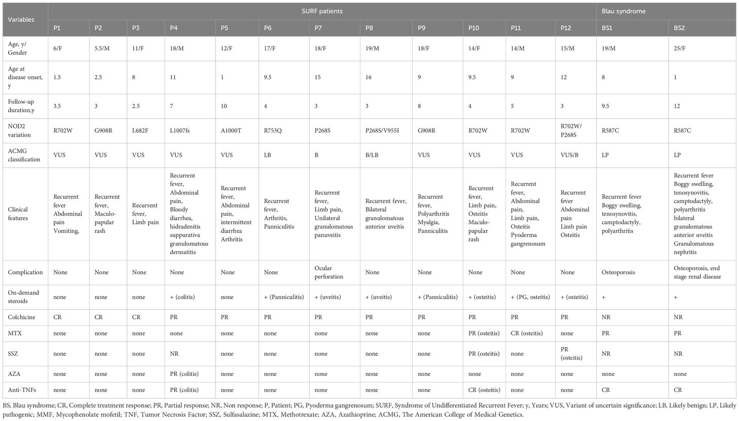 Twelve patients (53.8% female) with NOD2 variants classified as non-pathogenic and a diagnosis of SURF were enrolled at a median age of 14.5 years. Demographic characteristics, clinical features, and treatment data are presented in Table 1.