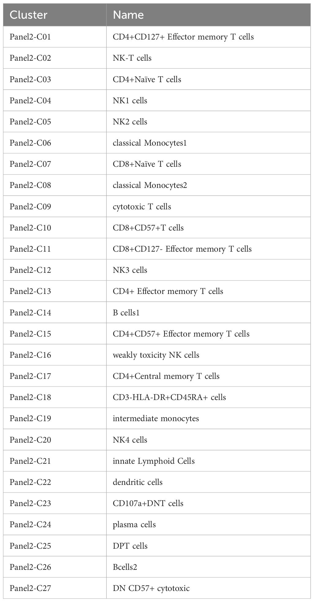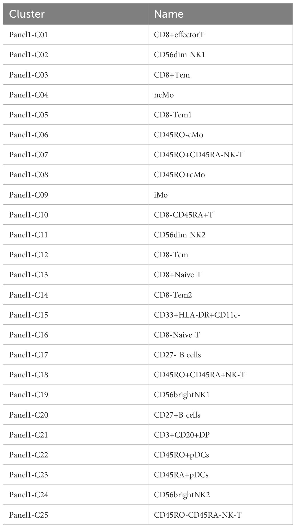 The clinical characteristics of the patients are summarized in Table 2. Twenty-five immune cell populations were identified using Panel 1 (Table 3, Figure 1), with T cells accounting for the highest proportion (43.47%, 11 subpopulations), followed by monocytes (26.09%, 4 subpopulations) and NK cells (21.95%, 4 subpopulations). B cells (5.07%), plasmacytoid dendritic cells (1.51%), and CD33 HLA-DR myeloid cells (1.53%) were the least dominant cells.