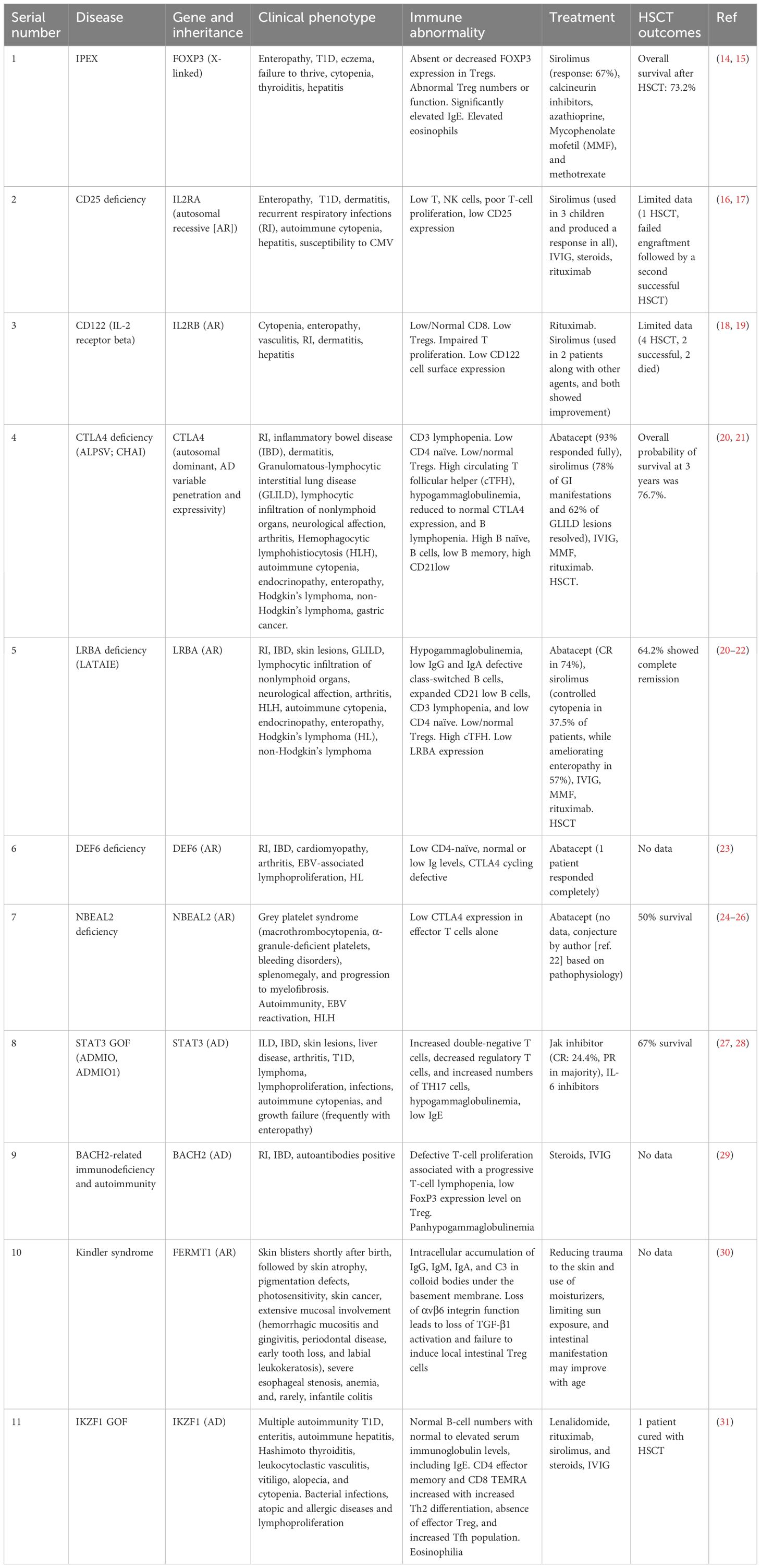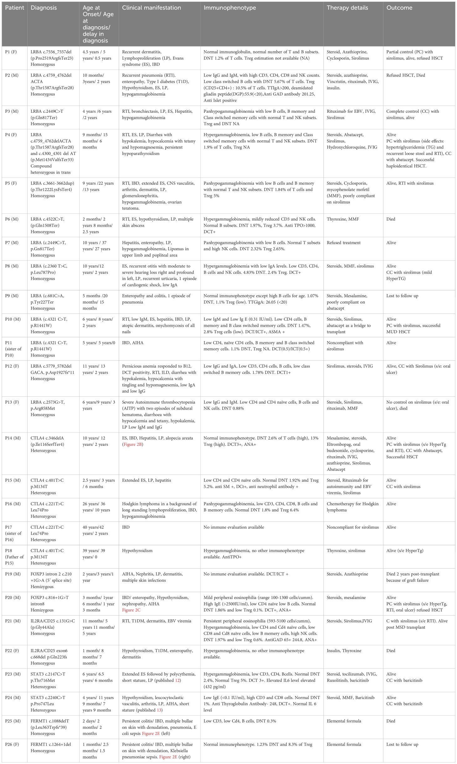 Resistance to microbial pathogens is a key factor in evolutionary processes. Therefore, immunity gene clusters are hotspots of positive selection across species (1). The adaptive immune system not only responds to an enormous diversity of microbes but also provides optimal accommodation to the body’s commensals and fetus, while maintaining robust unresponsiveness to self-antigens. Thus, evolution has allocated significant assets to safeguard against self-reactivity, with the chief assets being T regulatory cells (Tregs). These mysterious thymic lymphocytes were characterized as carrying the cell surface receptor CD25 by Sakaguchi in 1995 (2), which led to the isolation of human Tregs in 2001 (3, 4), both in the thymus and peripheral blood of healthy individuals. The term tregopathies (5) was first introduced in 2018 and encompasses a group of inborn errors in immunity (IEI), in which the affected immune regulatory target is the Treg cell itself. In the latest 2024 IUIS classification, this list includes gene defects in forkhead box P3 (FOXP3) (X-linked), IL2RA (autosomal recessive [AR]), IL2RB (AR), cytotoxic T lymphocyte antigen 4 (CTLA4; autosomal dominant [AD]), lipopolysaccharide-responsive and beige-like anchor protein (LRBA [AR]), DEF6 (AR), NBEAL2 (AR), STAT3 GOF (AD), BACH2 (AD), FERMT1 (AR), and IKZF1 GOF (AD) (6). Herein, we present a case series of 26 patients with various Treg pathway defects who presented with multiple autoimmune complications and a review of the literature.