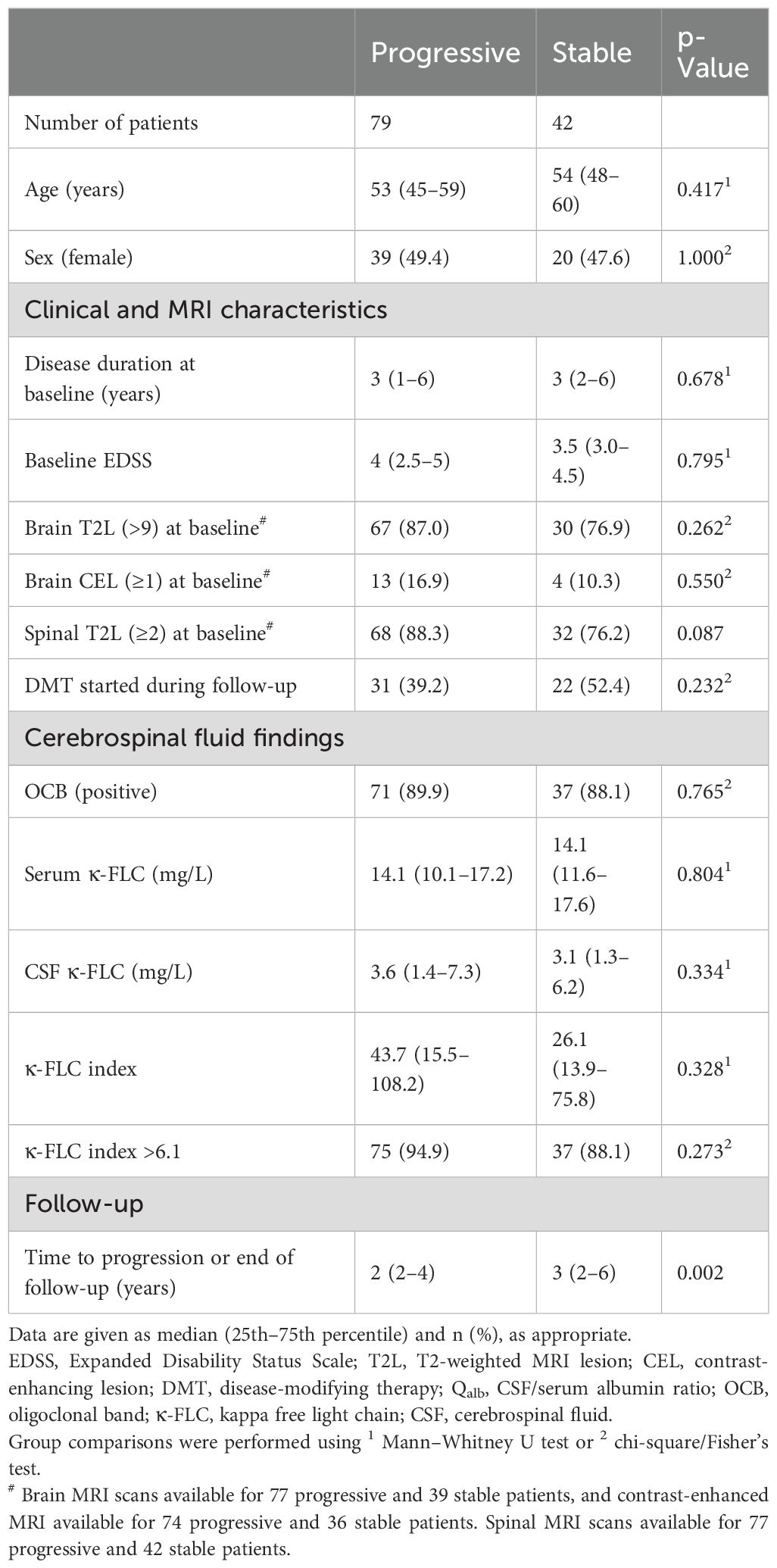 A total of 79 (65.3%) patients had disability progression during follow-up. In univariate analyses, age, sex, disease duration, EDSS, T2L, and CEL at baseline were similar between progressive and stable PPMS patients. The proportion of patients on DMT during follow-up was comparable between the two groups (Table 2). The median κ-FLC index determined at baseline was numerically higher in progressive patients (43.7; 15.5–108.2) compared to the stable group (26.1; 13.9–75.8); however, this difference did not reach statistical significance (p = 0.328; Table 2).