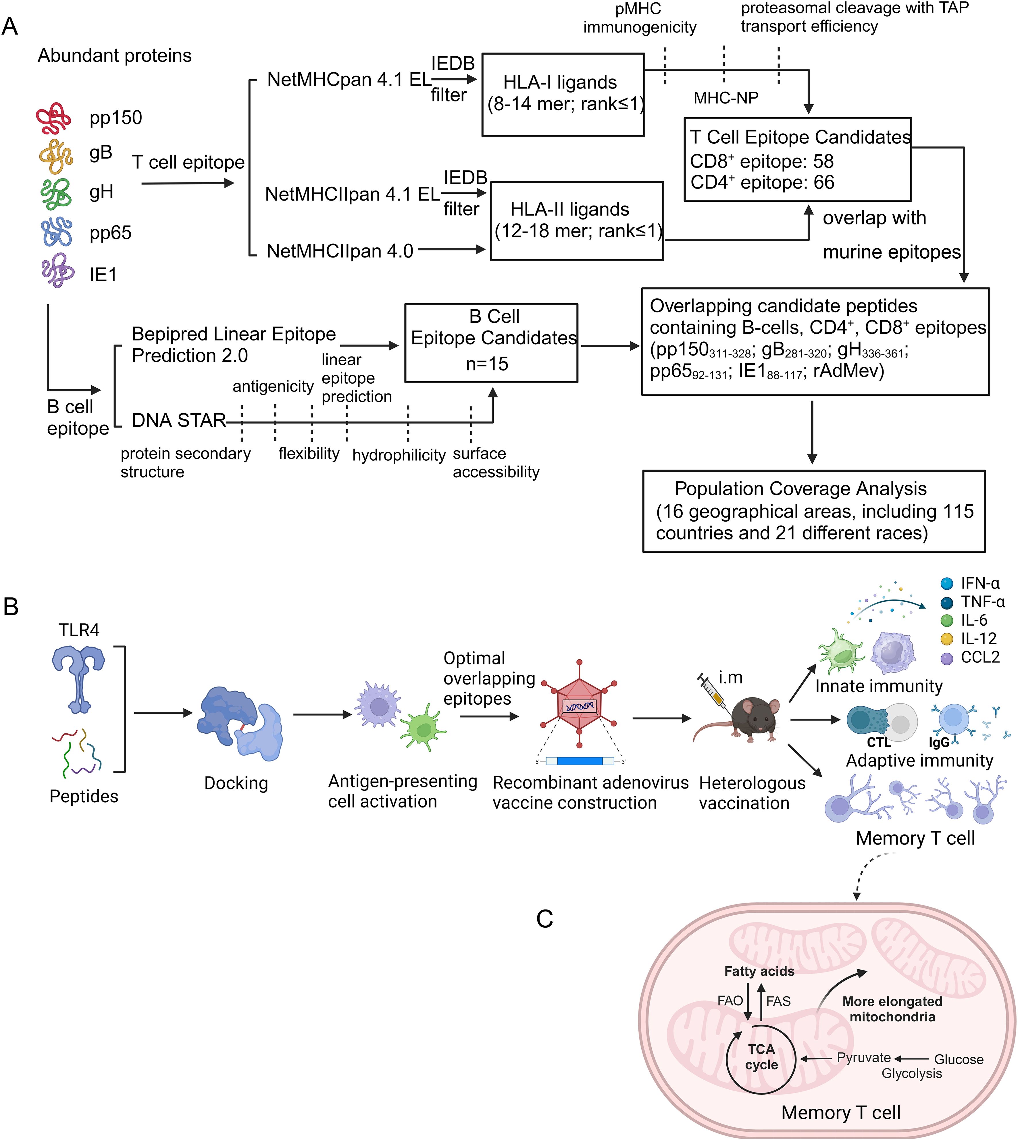 Figure 1. Visual summary of T and B cell epitope prediction and validation of multiple epitope-based recombinant adenovirus vaccines. (A) Overview of CD4/CD8 T cell and B cell epitope prediction workflows. We employ bioinformatics to analyze five proteins derived from human cytomegalovirus to examine the coverage of high-frequency HLA alleles and the immunogenicity of the predicted epitopes. B-cell epitope regions were followed by filtering for protein secondary structure, antigenicity, flexibility, linear epitope prediction, hydrophilicity and surface accessibility. (B) The screened overlapping epitope peptides were recombined into adenovirus vectors, as well as mice were inoculated heterologously to assess the safety and effectiveness of the vaccine. (C) Metabolic traits of memory T cells. FAO and OXPHOS maintain the survival and energy requirements of T cells during memory T cell differentiation.