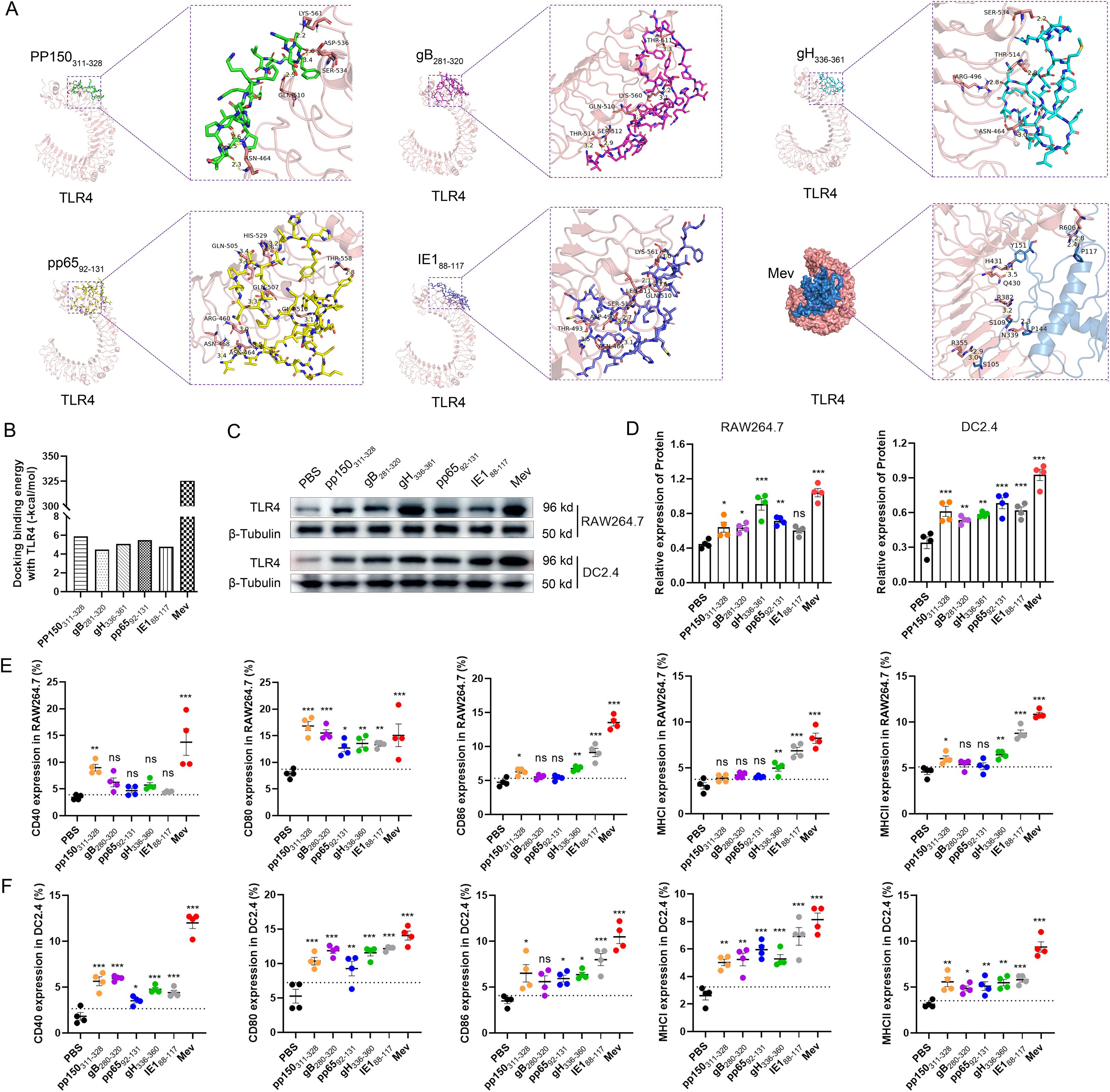 Figure 2. Molecular docking diagrammatic sketch. (A) Molecular docking of the candidate peptides pp150311-328, gB280-320, gH336-360, pp6592-131, and IE188–117 and Mev individually with TLR4 (PDB ID: 4G8A). The structure of Mev protein is displayed in blue, and the TLR4 receptor structure is displayed in pink. The protein-protein interaction residues are highlighted on the right and the hydrogen bonds are indicated by the yellow dashed lines. (B) Evaluation of binding energies released through the molecular docking. After incubation of HCMV candidate peptides with DC2.4 and RAW264.7 cells for 48 hours, the surface expression of TLR4 receptors was detected using Western blotting. β-Tubulin served as an internal reference, while PBS acted as the negative control (C, D). The percentages of surface markers CD80, CD86, CD40, MHCI and MHCII were detected by flow cytometry (E, F). All experimental groups were compared with PBS to analyze statistical differences. The dotted black lines indicate the mean of the negative control group plus 2 standard errors. Each experiment was independently conducted at least three times. One-Way ANOVA followed by Tukey’s test was applied in (D–F) *P < 0.05, **P < 0.01, ***P < 0.001.