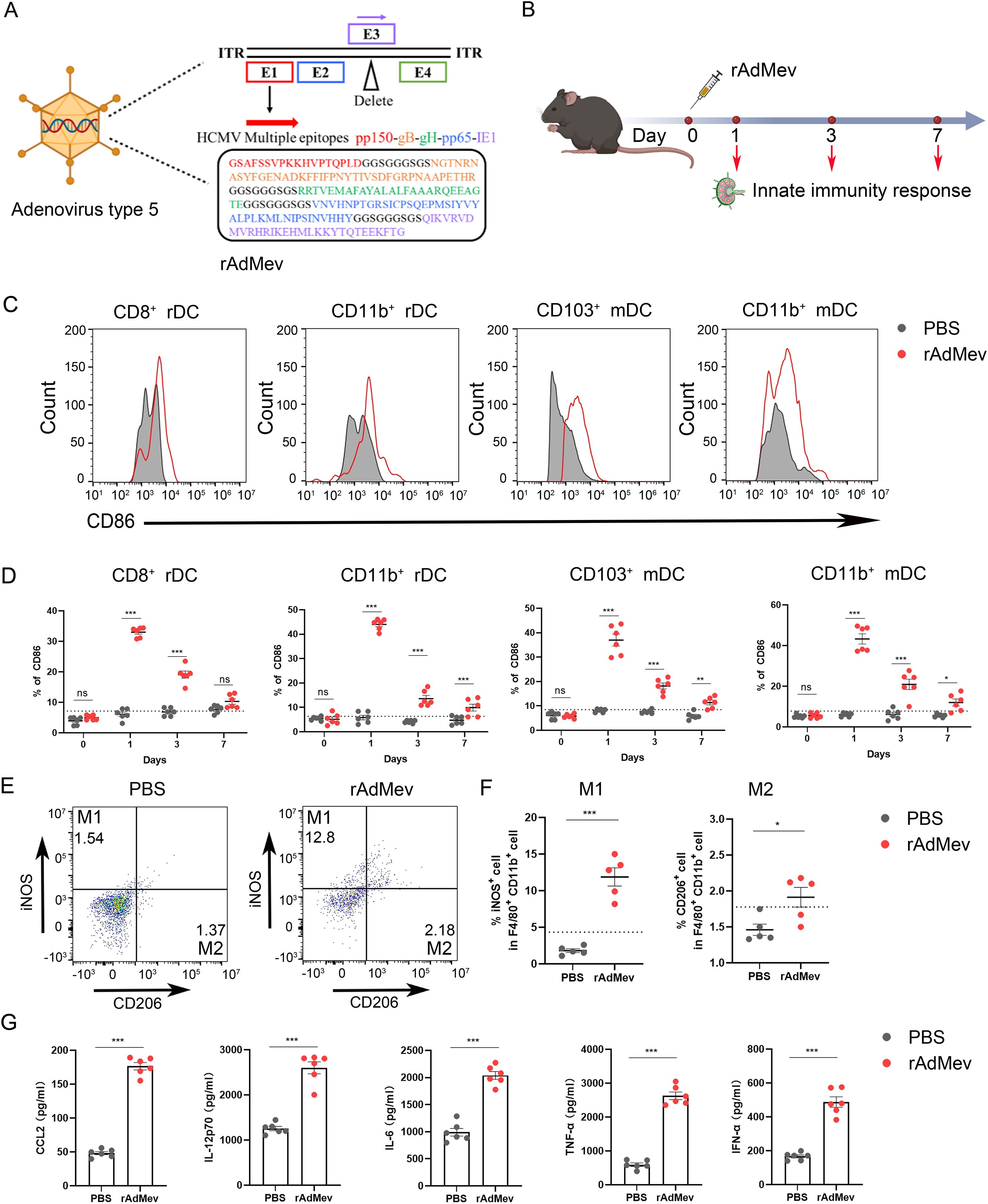 Illustration depicting adenovirus type 5 used in a study. Diagram A shows the structure and gene modifications of the adenovirus. Diagram B illustrates the experimental timeline of rAdMev administration in mice and corresponding immune response observations over time. Graphs C display flow cytometry histograms for CD86 expression in different dendritic cell subsets. Graphs D compare the percentage of CD86 expression on dendritic cells over several days. Plots E and F show flow cytometry analysis of macrophage polarization markers INOS and CD206, with statistical comparison. Graph G presents cytokine levels for CCL2, IL-12p70, IL-6, TNFα, and IFNγ in PBS and rAdMev groups.