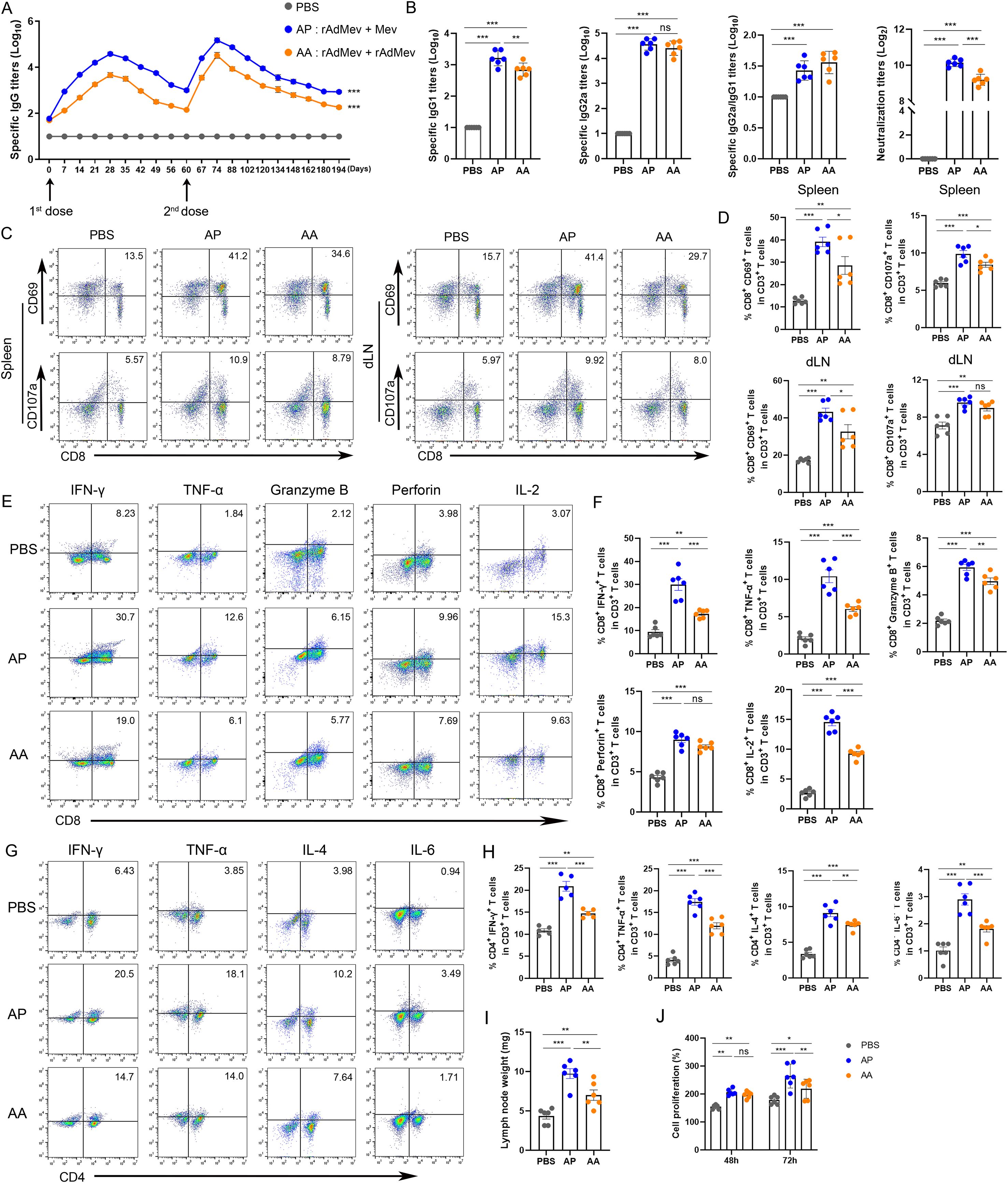 C57BL/6 mice underwent an intramuscular immunization with a rAdMe on day 0, followed by either a homologous booster with rAdMev (AA) or a heterologous booster with Mev (AP) at day 60 (Figure 4). To further evaluate differences in humoral immunity provoked by heterologous and homologous vaccinations, we continuously monitored the production of specific antibodies in mouse sera. The peak of IgG-specific antibodies was reached 14 days after the second immunization, and induced significantly higher levels of IgG-specific antibodies than the second (Figure 4A). Heterologous vaccination produced better antibody levels than homologous vaccination, including neutralizing antibodies, IgG1, and IgG2a (Figure 4B). The IgG2a: IgG1 ratio indicated a more Th1-oriented immune response. Collectively, these data suggested that heterologous boosters are more efficient at eliciting multiple specific antibody clones, associated with enhanced antiviral antibody responses. Subsequently, antigen-specific T cell responses were measured in both the spleen and draining lymph nodes 14 days after the administration of the second dose. Our findings revealed detectable antigen-specific CD8 T-cell responses in these tissues, that include CD69 upregulation, degranulation (CD107a) production (Figures 4C, D), draining lymph nodes enlargement, and CTL proliferation (Figures 4I, J). Significantly, the heterologous inoculation (AP) exhibited superior efficacy compared to its homologous counterpart (AA), consistent with previous investigations. In vitro stimulation of T cells with overlapping peptide pools in vitro, demonstrated that heterologous vaccination can produce peptide-specific CD8+ T cells, secreting an array of immunomodulatory molecules, including IFN-γ, TNF-α, granzyme, perforin, and IL-2, indicating their potent cytotoxic responses (Figures 4E, F). The crucial role of helper T cell immunity in virus infection control was highlighted in our study. Frequencies of TNF-α, IFN-γ, IL-4, and IL-6 secreted by CD4 T cells exhibited a significant elevation under the influence of the heterologous booster, indicating T cell polyfunctionality. Levels of IL-4 secreted by CD4 T cells were comparable to those induced by homologous boosters (Figures 4G, H), underscoring that heterologous vaccination elicits a well-balanced Th1/Th2 vaccine response.