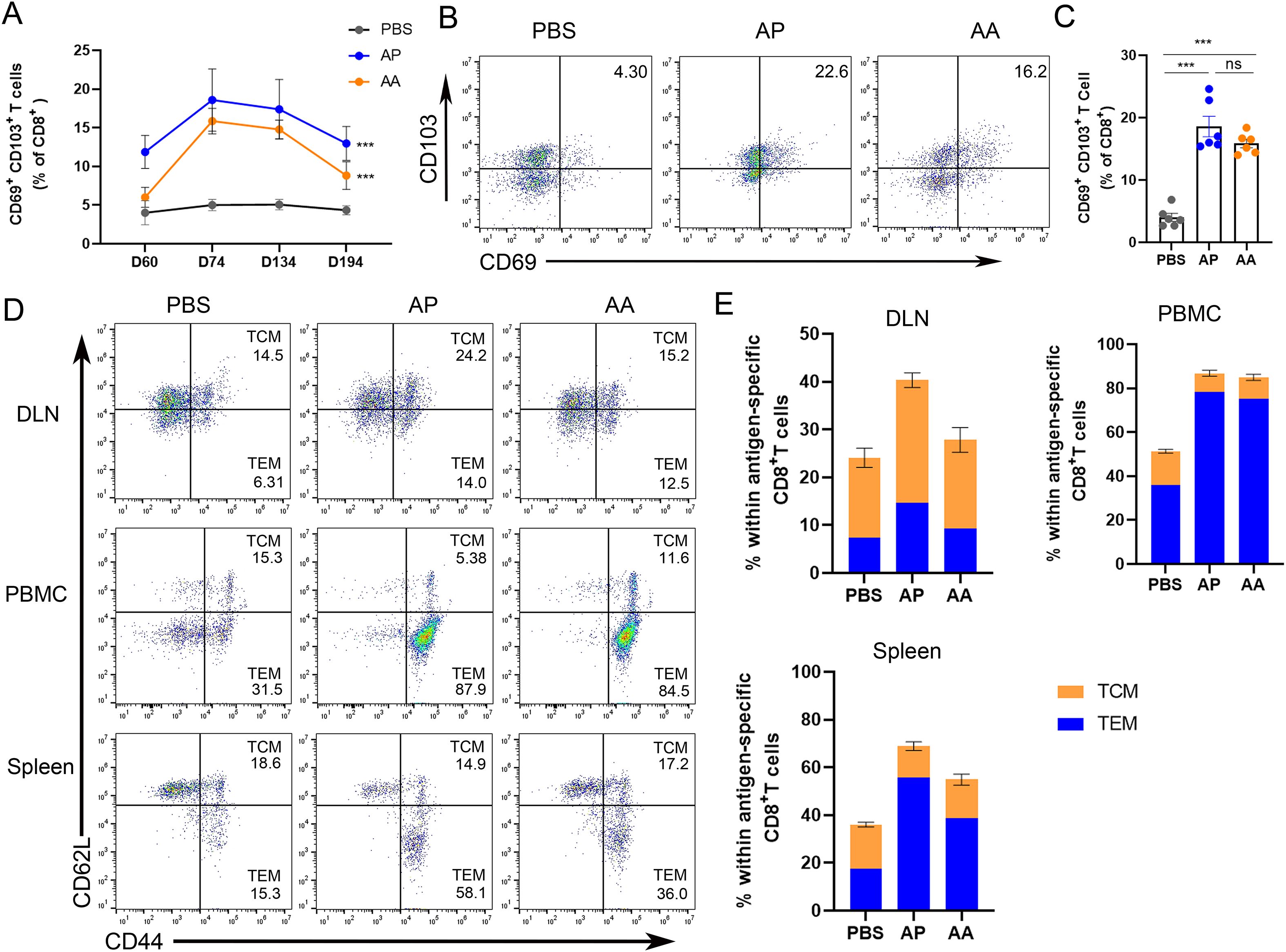 Fourteen days after the second immunization, mouse blood was collected via the infraorbital vein to isolate peripheral blood mononuclear cells (PBMC). Subsequently, mice were euthanized by cervical dislocation, and spleens and draining lymph nodes were isolated to prepare single-cell suspensions (n=6). The subtypes and activation status of memory T cells was employed to assess by Flow cytometry, and utilizing the following fluorescently labeled antibodies: Pacific Blue-CD3 (Biolegend, cat. 100213), APC/Cyanine7-CD8a (Biolegend, cat. 155015), FITC-CD44 (Biolegend, cat. 156007), PE/Cyanine7-CD62L (Biolegend, cat. 156007), PE/Cyanine7-CD69 (Biolegend, cat. 104511), and FITC-CD103 (Biolegend, cat. 110907).
