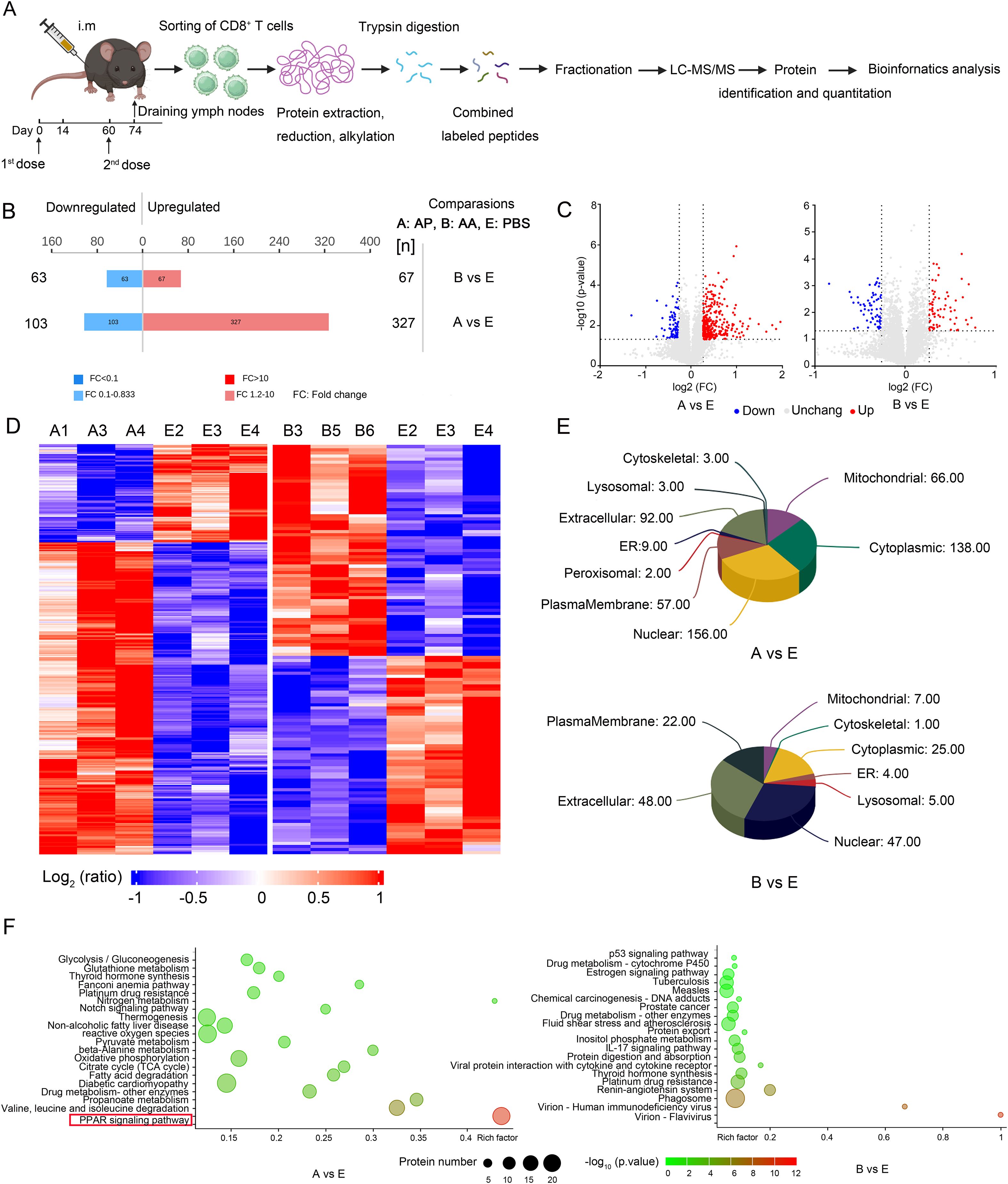 The proteome analysis was conducted similarly as previously described (39). CD8 T lymphocytes were isolated from the draining lymph nodes of mice subjected to various immunization protocols. Total cellular proteins were extracted, followed by enzymatic digestion (40) and TMT labeling of peptides. Labeled peptides were fractionated and analyzed on an Orbitrap 480 (Thermo) mass spectrometer. The quantitative information of the target protein set was normalized. Subsequently, the Complexheatmap R package (R Version 3.4) was utilized to classify the two dimensions of samples and protein expressions, generating a hierarchical clustering heat map. The sorted heatmap of the log2 fold-changes was generated using SPIN (41). The CELLO method (http://cello.life.nctu.edu.tw/) was employed for predicting subcellular localization. Additionally, Blast2GO was used for annotating the target protein set with GO annotations, and the KAAS (KEGG Automatic Annotation Server) software was utilized to perform GO annotation for the target protein set, including KEGG pathway annotation.