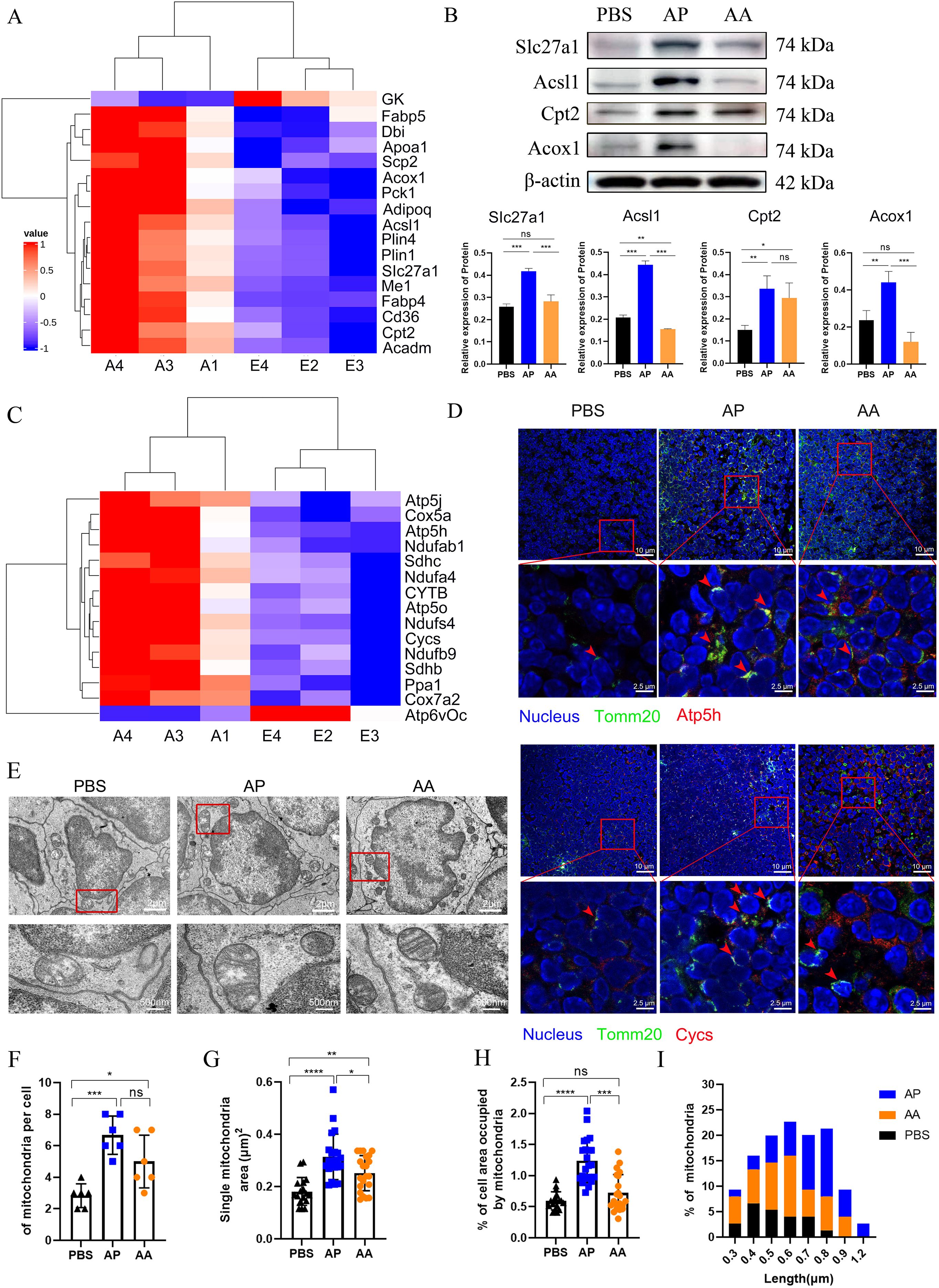 Sections of paraffin-embedded draining lymph nodes were subjected to a series of steps including deparaffinization, rehydration, and a 5-minute immersion in water before antigen retrieval was performed in a microwave oven using sodium citrate buffer (pH 6.0) for 10 min. Repaired sections were blocked with a solution consisting of 5% bovine serum albumin and 0.05% Triton X-100 (Thermo, cat. 85111) for 30 minutes, followed by overnight incubation with primary antibodies at 4 °C. The secondary antibody (1:500) was incubated at room temperature in the dark for 1 hour and then washed with PBS containing Tween (PBST). Afterward, the sections were incubated with DAPI containing a fluorescence inhibitor for 5 minutes and then sealed with a coverslip. The primary antibodies were as follows: Tomm20 (Abclonal, cat. A11308), Atp5h (Abcam, cat. ab110275), and Cycs (Abcam, cat. ab110325). The secondary antibodies employed were goat anti-mouse-Cy3 (Beyotime, cat. A0521) and goat anti-rabbit fluorescein isothiocyanate (Abcam, ab6717). Image acquisition was performed using an Olympus Fluoview FV1200 microscope.
