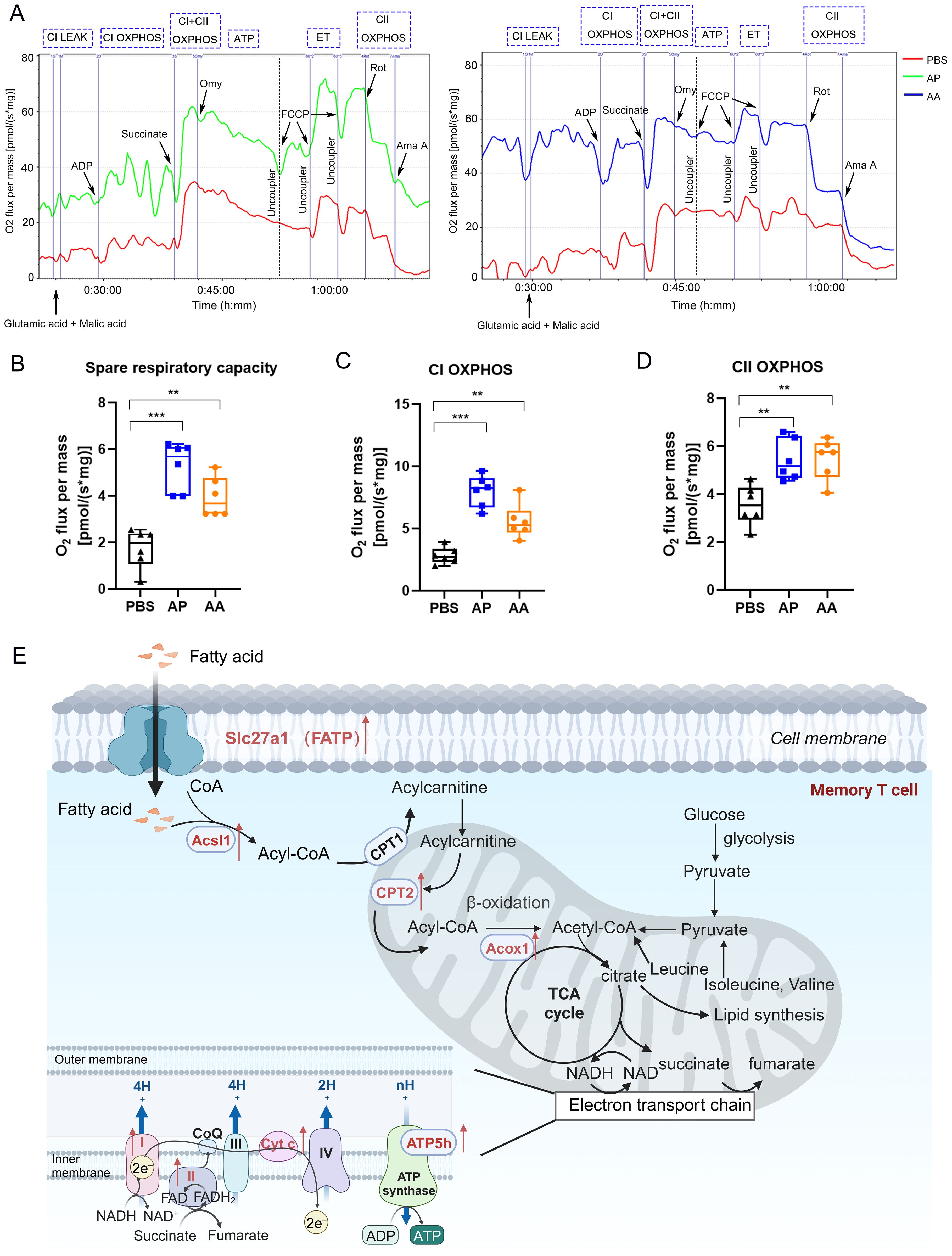 We assessed mitochondrial respiratory function by measuring the oxygen consumption rate (OCR). Differences in respiratory capacity under various treatment conditions were examined using a real-time high-resolution respirometer (Oxygraph-2k, Austria), following the protocol previously described (42, 43). OCRs were measured, normalized to protein concentration, and expressed as pmol of O2 per second per mg of protein. Data acquisition and analysis were performed with DatLab software. Sort mouse spleen CD8 T lymphocytes 14 days after second immunizations, grind the cells with a grinding pestle and expose the mitochondria to 2.1 ml of mitochondrial respiration medium MiR06, which contains 0.5mM EGTA, 20 mM HEPES, 110 mM sucrose, 10 mM KH2PO4, 20 mM taurine, 60mM K-lactobionate, 3mM MgCl2.6H2O, 1 mg/ml BSA, catalase 280 U/ml, pH 7.1.