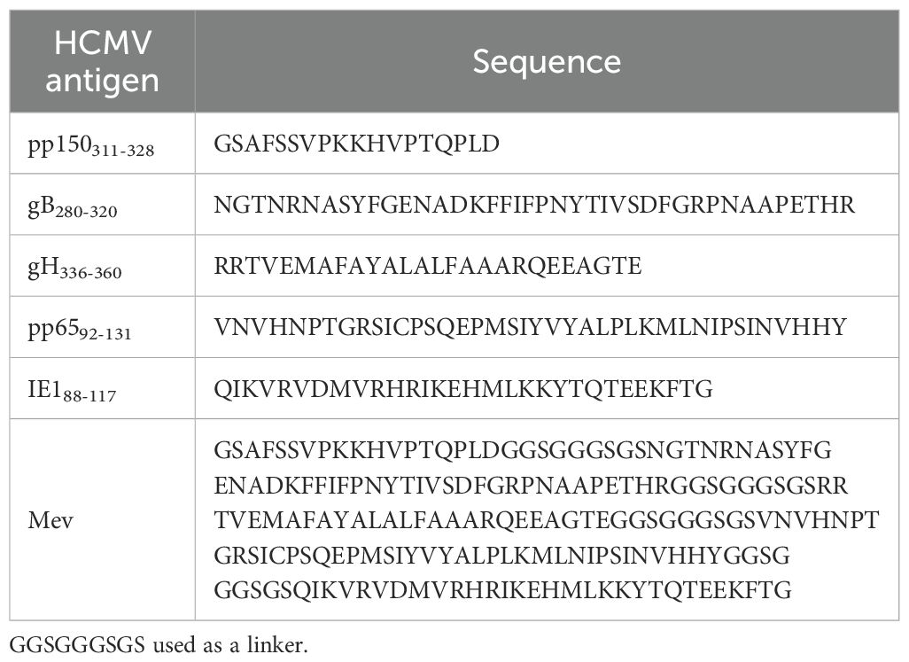 We also identified peptides derived from viral proteins predicted to bind murine MHC coded for by H2-Db, H2-Kb, and H2-IAb haplotypes (37). For the prediction of cell epitopes for murine MHC I/II genotypes, we employed the NetMHCpan EL 4.0 algorithm available in the IEDB database to align sequences of HCMV gB, pp150, pp65, gH, and IE1, with alignment length ranged from 8 to 14mers. To minimize the chance of epitope omission, we further utilized the SYFPEITHI database (https://syfpeithi.de/60-PredictEpitope.htm; http://g6altair.sci.hokudai.ac.jp/g6/service/pocasa/) for prediction, with alignment length ranged from 8 to 14 mers. We then selected longer sequence regions that were recognized by humans and mice to be used as vaccine antigens. The dominant epitope sequences for mice are provided in Supplementary Table S4.