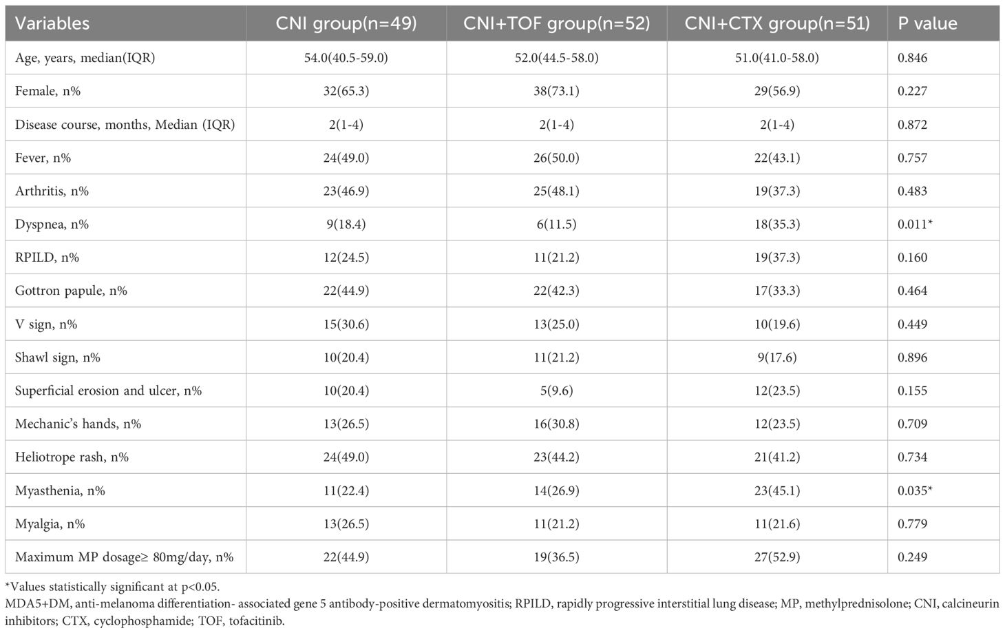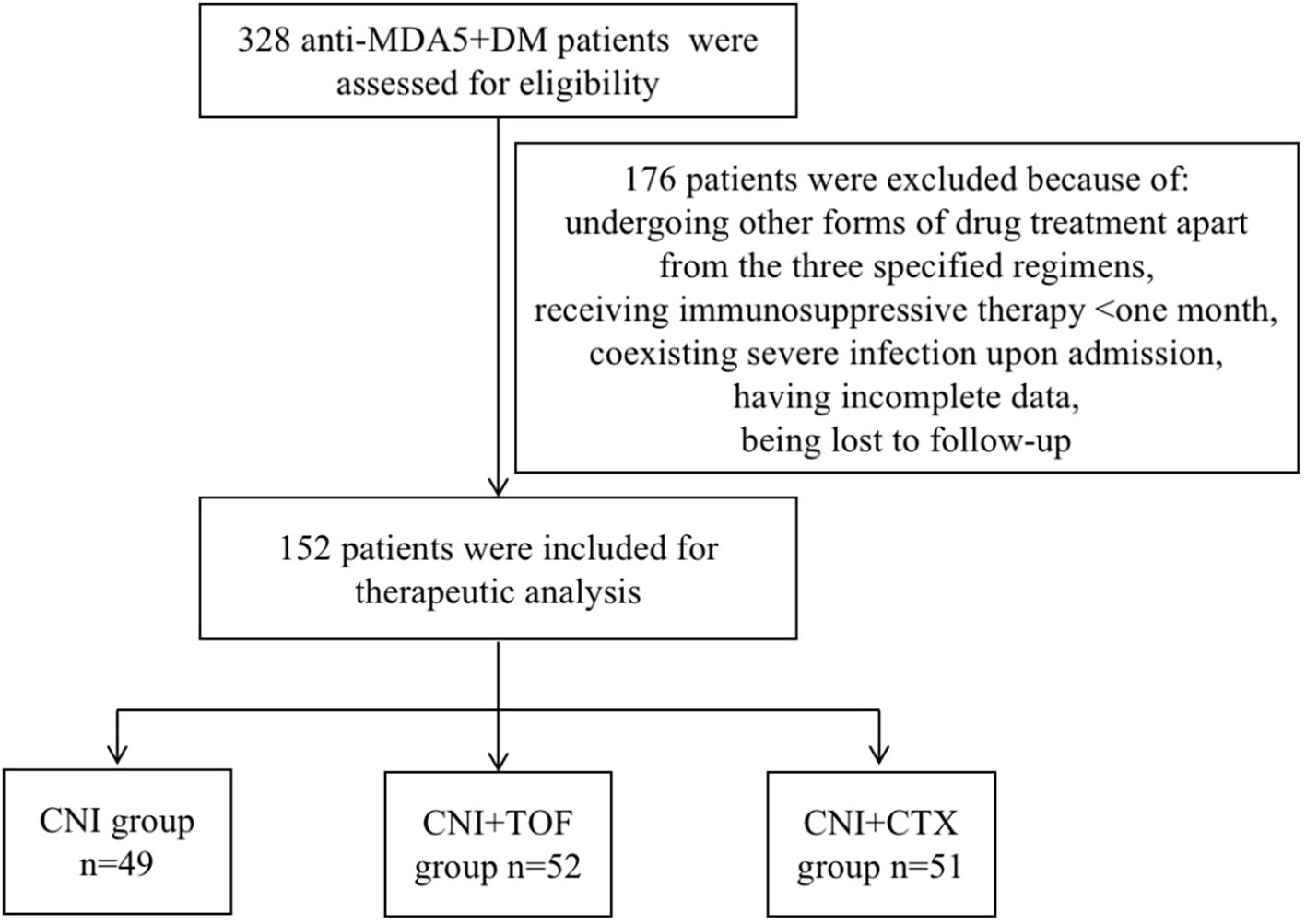 From August 2019 to June 2024, we reviewed 328 cases with MDA5+ DM from the departments of rheumatology, respiratory and ICU at the First Affiliated Hospital of Zhengzhou University. In total, 176 patients were excluded from the study. Their exclusion was due to undergoing other forms of drug treatment apart from the three specified regimens, receiving immunosuppressive therapy for less than one month, coexisting severe infection upon admission, having incomplete data, or being lost to follow-up. Finally, 152 patients were included in the analysis. Every patient among them suffers from interstitial lung disease. According to initial immunosuppressive regimens after admission, these patients were divided into CNI group (n=49, 32.2%), CNI+TOF group(n=52, 34.2%), and CNI+CTX group(n=51, 33.6%). The screening process of the patients were shown in Figure 1.