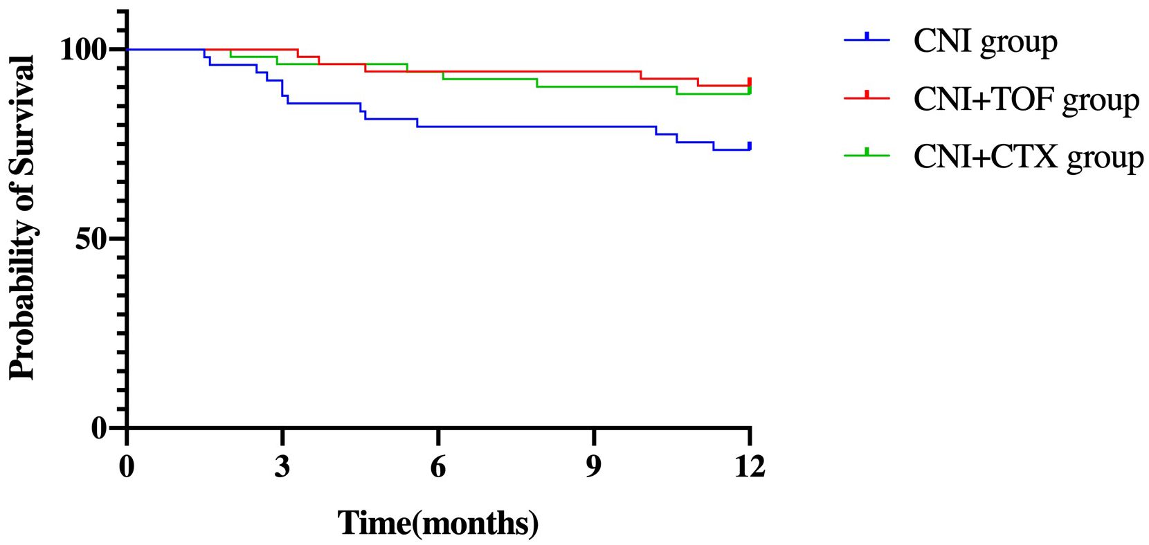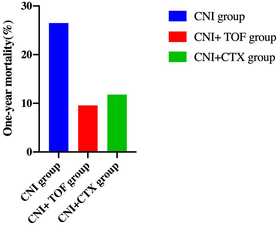 Cumulatively, a total of 24(15.8%) patients died within one year. The CNI group showed a higher 1-year mortality compared to CNI+TOF and CNI+CTX group (26.5% vs 9.6% vs 11.8%, p=0.042) (Figure 2). While, the 1-year survival rate was significantly lower in the CNI group compared to combination groups (logrank P = 0.032) (Figure 3).