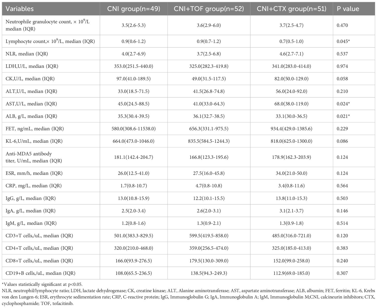 The baseline demographic features, clinical manifestations, laboratory data and treatments between three groups were recorded in Tables 1 and 2. The three groups had similar ages, gender distributions and disease course. Dyspnea (p=0.011) and myasthenia (p=0.035) were more prevalent in the CNI+CTX group, while RPILD incidence did not differ (p=0.160). All patients received GCs, with comparable rates of maximum methylprednisolone (MP) dosage ≥80 mg/day at baseline (p=0.249). Laboratory results demonstrated that the CNI+CTX group had significantly lower lymphocyte counts (p=0.045) and albumin (ALB) levels (p=0.021), as well as significantly higher aspartate aminotransferase (AST) levels (p=0.024).