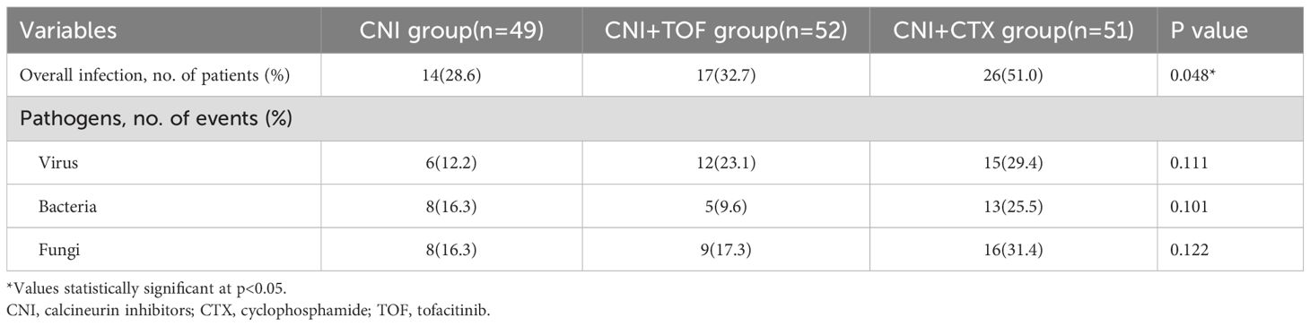 Serious infection events within 1 year were summarized in Table 3. In total, 14(28.6%) patients in the CNI group, 17(32.7%) patients in the CNI+TOF group and 26 (51.0%) patients in the CNI+CTX group had infectious SAEs (P = 0.048). Cytomegalovirus (CMV) was the most common viral infection, with Aspergillus and Pneumocystis jirovecii (PJP) as major fungal pathogens. The CNI+CTX group had higher rates of viral, bacterial, and fungal infections, though not statistically significant.