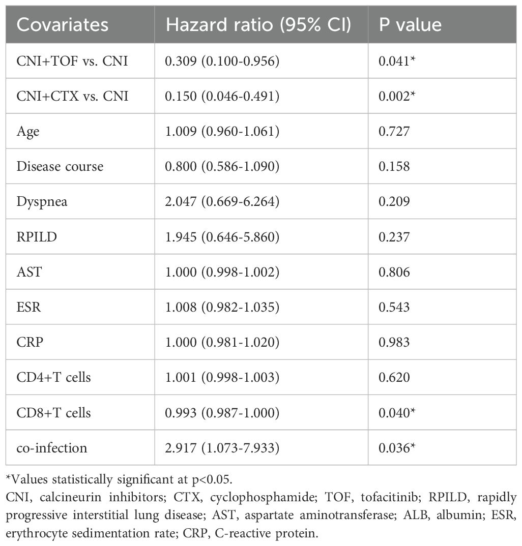 We assessed the differences between patients survived or died within one year, and further, conducted the potential risk factors for death. In the univariable analysis, age, disease course, dyspnea, RPILD, AST, ESR, CRP, CD4+T cells, CD8+T cells, co-infection and treatments showed significant association with death(all p<0.05). Multivariate analysis showed CNI+TOF(HR = 0.309, 95% CI: 0.100-0.956, p=0.041, compared to CNI), CNI+CTX(HR = 0.150, 95% CI: 0.046-0.491, p=0.002, compared to CNI), and CD8+T cells (HR = 0.993, 95% CI: 0.987-1.000, p=0.040) as protective factors, while, co-infection (HR = 2.917, 95% CI: 1.073-7.933, p=0.036) was a risk factor (Table 4).