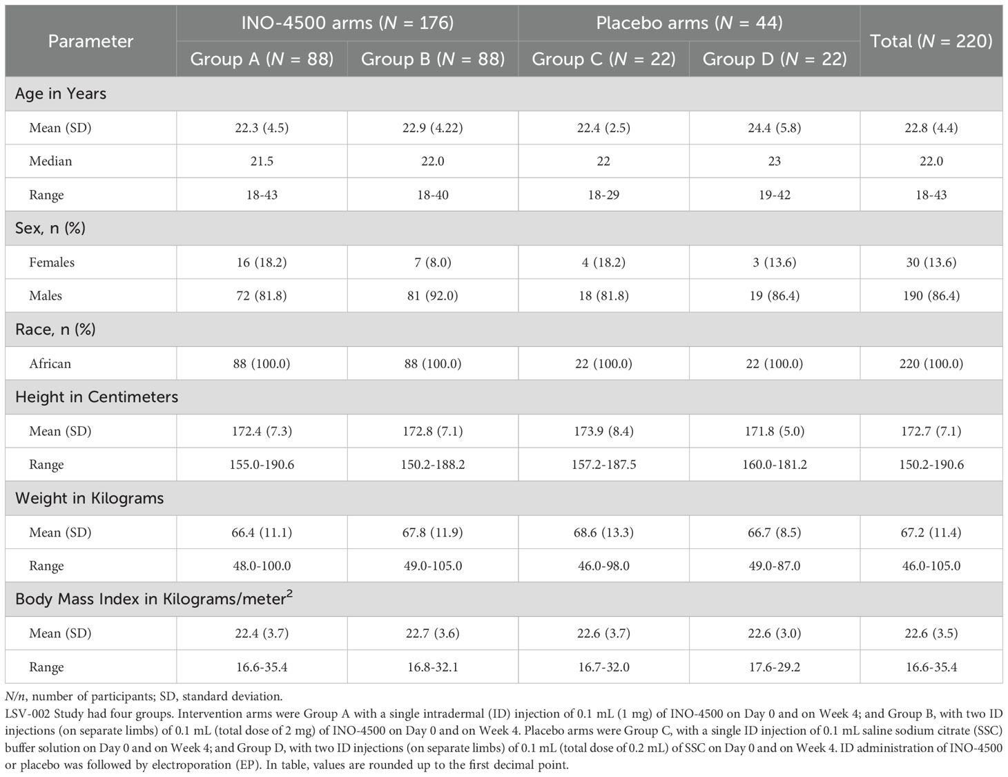 Potential participants were consented and screened. Participants meeting eligibility criteria were randomized in a blinded fashion to one of four groups across the two dose regimens, either receiving active investigational product (INO-4500; 176 participants) or placebo (saline sodium citrate [SSC] buffer solution; 44 participants) (Figure 1). Blinding of INO-4500 and placebo was in place for the participants, sponsor, and all clinical site staff, except for the site pharmacy staff who were not involved in any post-vaccination assessments. Group A received a single 1 mg INO-4500 (0.1 ml of a 10 mg/ml solution) ID injection at Day 0 and Week 4 (± five days), totaling 2 mg, while Group B received two 1 mg INO-4500 (0.1 ml of a 10 mg/ml solution) ID injections on different limbs at the same timepoints, totaling 4 mg. Group C received a single ID injection of 0.1 ml SSC (placebo) at Day 0 and Week 4 (± five days), while Group D received two ID injections of 0.1 ml SSC (placebo) on different limbs at the same time points. All ID injections were followed by EP using the CELLECTRA™ 2000 ID device (Inovio Pharmaceuticals) delivering four pulses of 52 milliseconds and 0.2 amps. For all groups, the first dose of INO-4500 or placebo dose occurred at Day 0, within 60 days of screening.