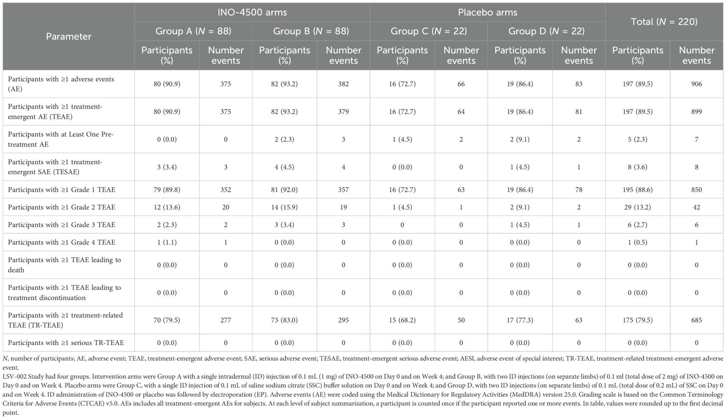 The safety analysis included all participants in the Safety population, who received at least one dose of INO-4500 or placebo administered by ID injection. TEAEs were defined for this trial as any AEs/SAEs that occurred on or after Day 0. All TEAEs and serious TEAEs were summarized by frequency and percentage. Laboratory response variables were descriptively summarized by time point and as changes from baseline. As an early clinical phase study, the safety evaluation focused on identifying safety signals or concerns of clinical relevance rather than potential statistical differences. Thus, no formal statistical testing was performed.