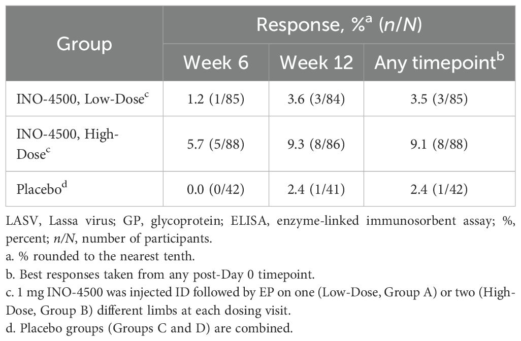 Results: INO-4500 was well tolerated, with no Grade 3 or higher treatment-emergent adverse events (TEAEs) deemed to be related to the intervention; 88.6% of all TEAEs were Grade 1. No cases of attributable hearing loss were reported. INO-4500 groups demonstrated statistically significant increases in Lassa virus GPC-specific binding antibodies at Weeks 6 and 12 compared to placebo, with the 2 mg group eliciting the strongest responses. T cell responses remained elevated above baseline through Week 48 in both INO-4500 groups, indicating durable cellular immunity.