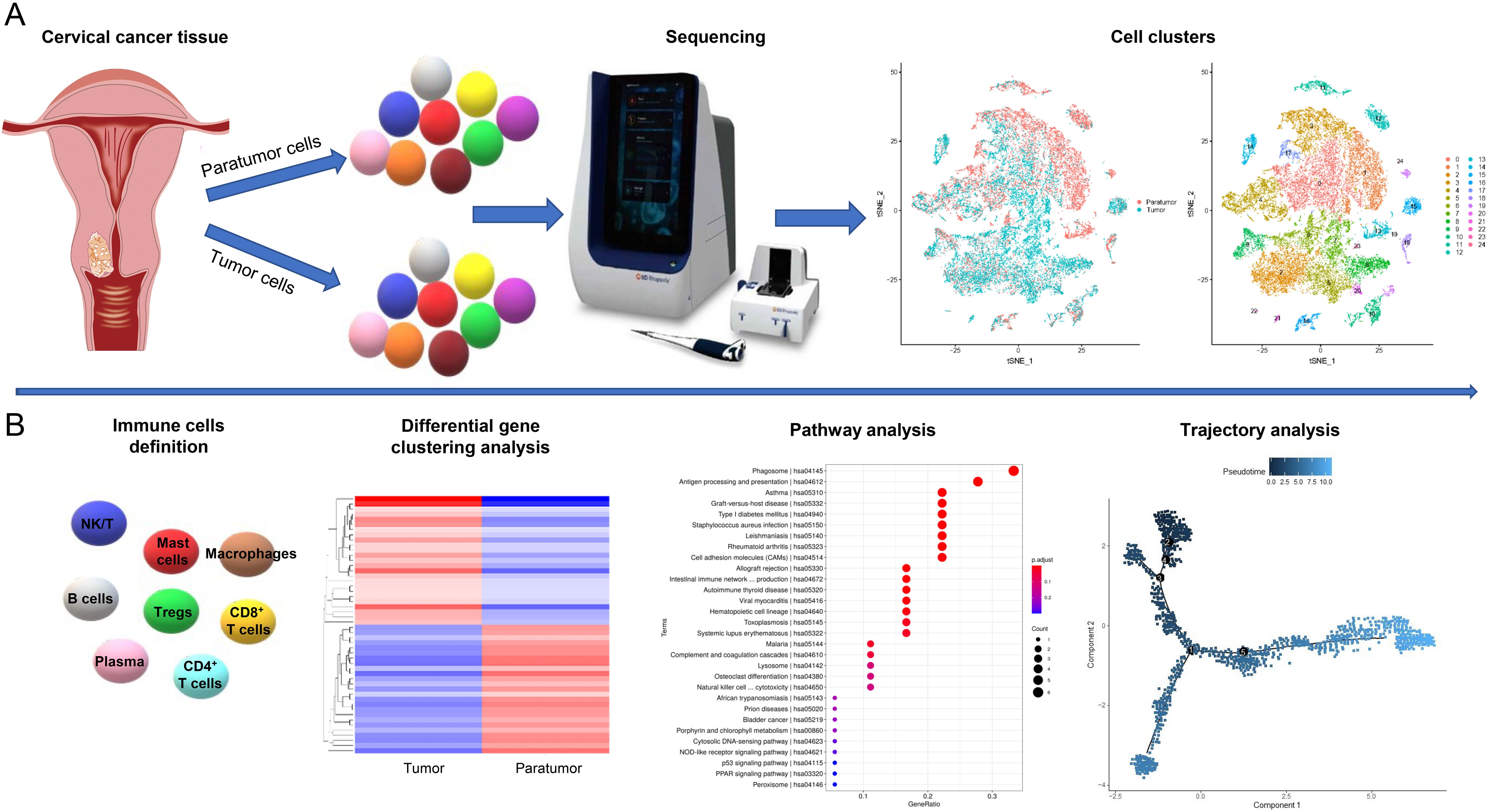 Samples of cervical squamous cell carcinoma (CSCC), both tumor and paratumor, were procured from the tumor mass and regions located 1 cm away from the tumor boundary, respectively. The tissue samples were washed with PBS (CORNING) before being stored in MACS Tissue Storage Solution (Miltenyi Biotec). Subsequently, they were processed into single-cell suspensions.