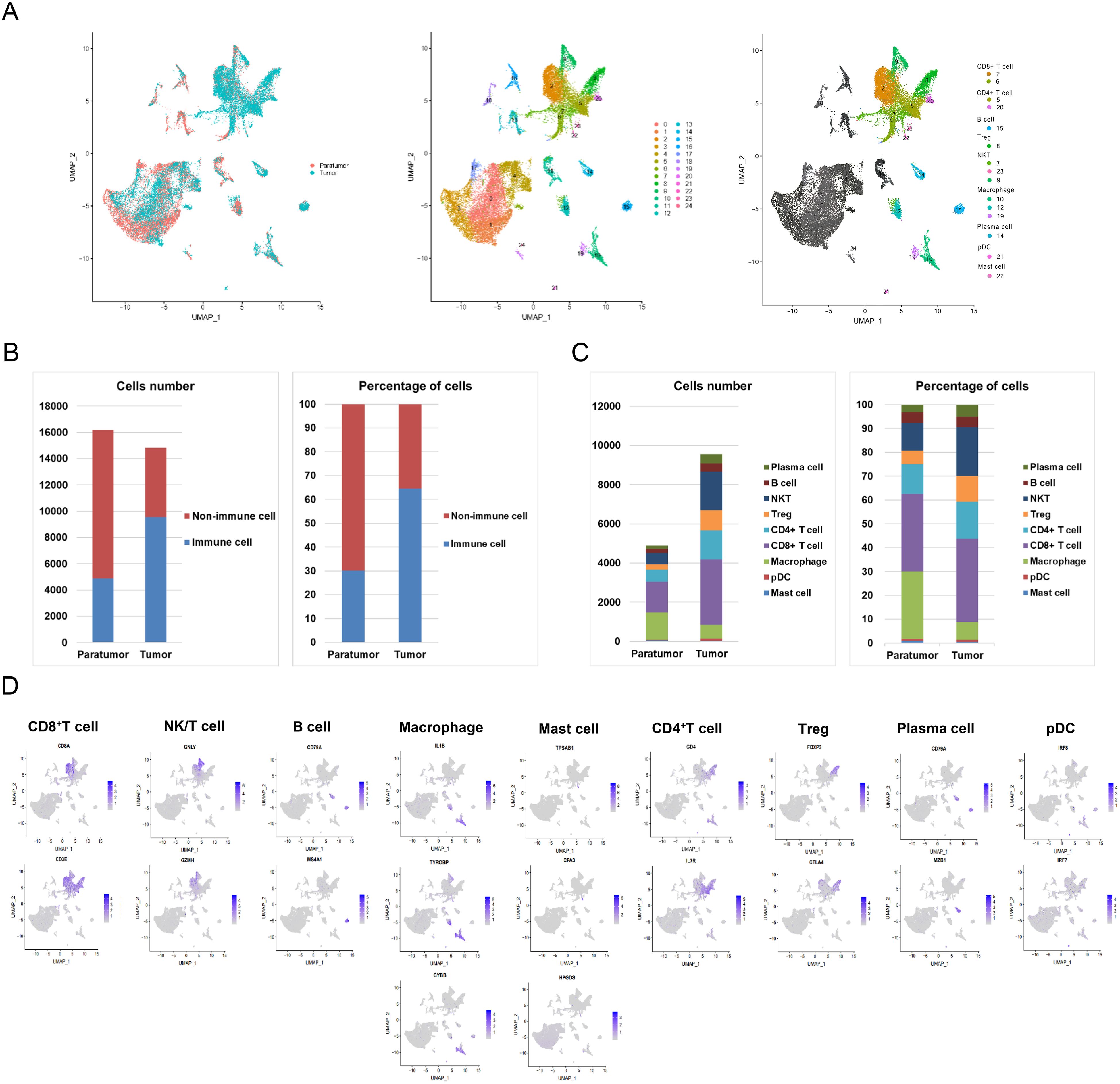 Figure 2. Spatial Distribution of Immune Cell Subsets. (A) Uniform Manifold Approximation and Projection (UMAP) visualization of major immune lineages identified via graph-based clustering. (B) Bar chart showing the counts and proportions of immune and non-immune cells in paratumor and tumor tissues. (C) Detailed quantification and proportion of all immune cell types in paratumor and tumor tissues. (D) Expression of cell-type-specific marker genes mapped onto the UMAP plot.