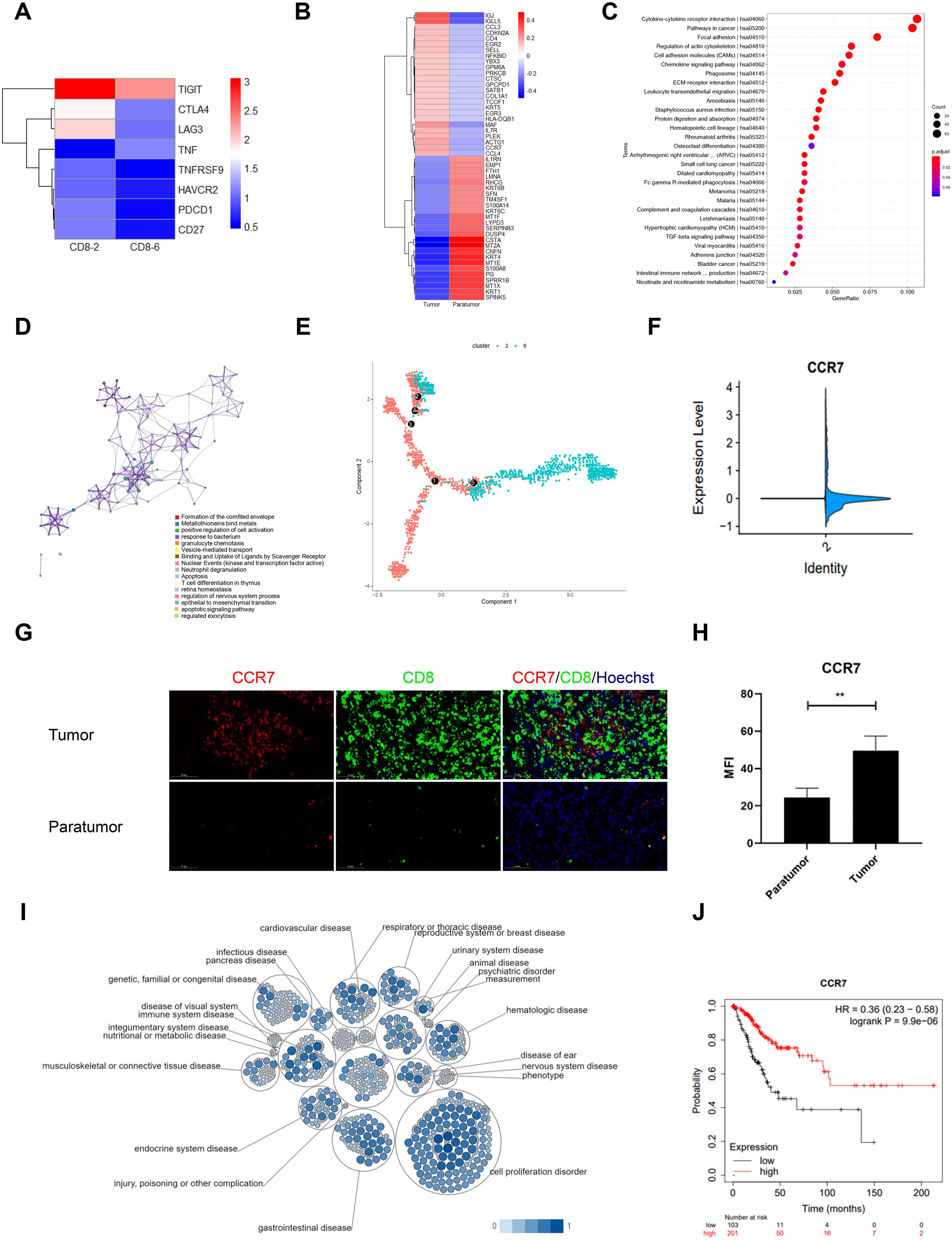 Figure 3. Gene Signature of CD8+ T Cells in Cervical Squamous Cell Carcinoma (CSCC). (A) Heatmap of inhibitory checkpoint expression in CD8+ T cell clusters 2 and 6 generated by Heml 1.0. (B) Top 50 differentially expressed genes (DEGs) in exhausted CD8+ T cells between tumor and paratumor tissues. (C) KEGG pathway analysis of DEGs in exhausted CD8+ T cells; circle size denotes gene count, color indicates adjusted p-value. (D) Reactome pathway enrichment via Metascape with spider plot visualization. (E) Trajectory analysis of CD8+ T cells in CSCC. (F) CCR7 expression comparison between tumor and paratumor tissues. (G) Immunofluorescence analysis of CCR7 and CD8 expression; scale bar, 50 μm. (H) Mean fluorescence intensity of CCR7 in tumor versus paratumor tissues (**p < 0.01). (I) Pathway and disease association of CCR7 analyzed using Open Targets. (J) Prognostic impact of CCR7 in CSCC assessed by KM-plotter.