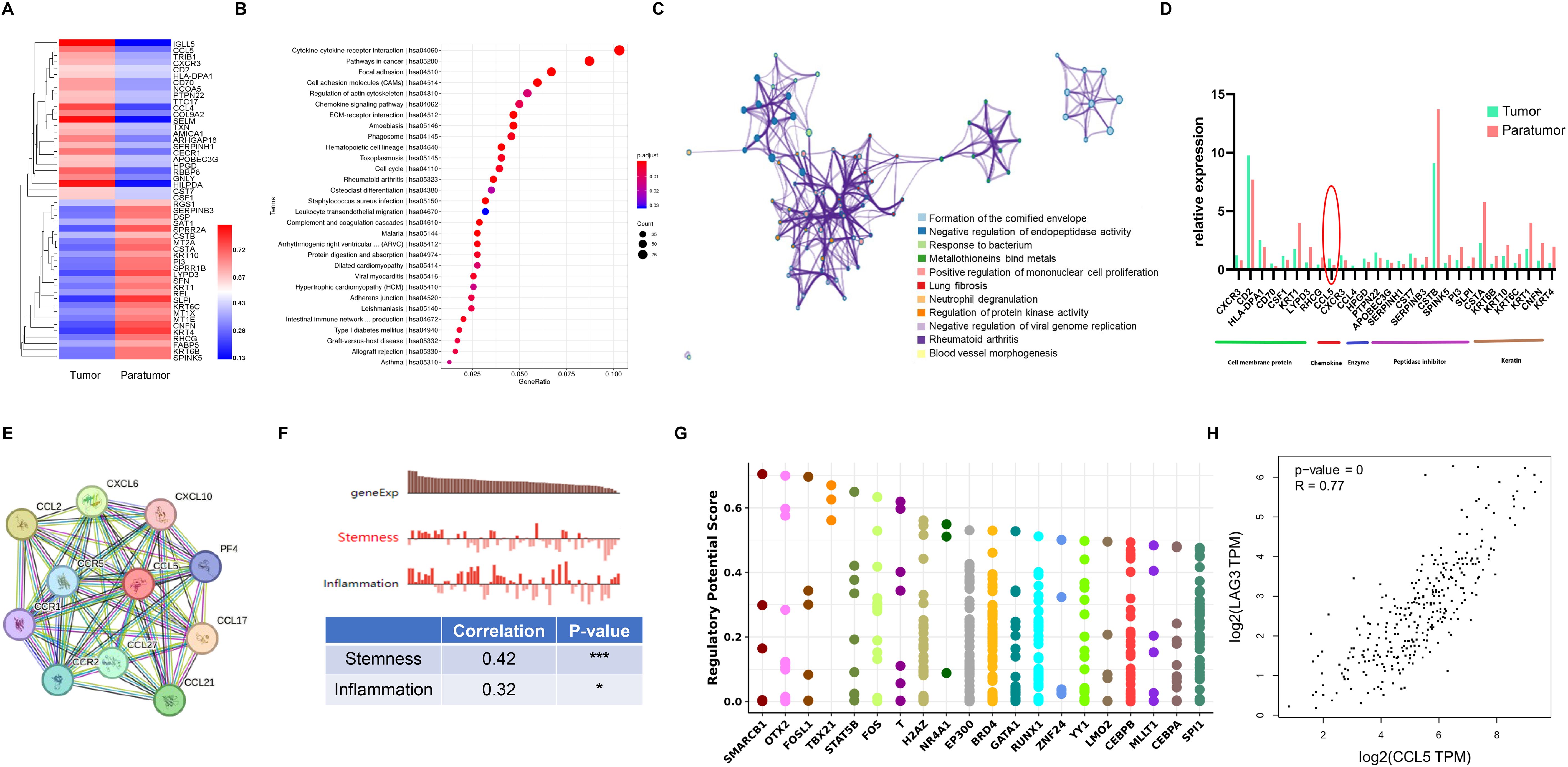 Figure 4. Treg Gene Signature in Cervical Squamous Cell Carcinoma (CSCC). (A) Heatmap of the top 50 differentially expressed genes (DEGs) in Tregs between tumor and paratumor tissues. (B) KEGG pathway analysis of Treg DEGs; circle size reflects gene count, color indicates adjusted p-value. (C) Reactome pathway enrichment via Metascape (https://metascape.org/gp/index.html) with spider plot visualization. (D) Expression profiles of key molecules in Tregs. (E) Protein interaction network of CCL5 mapped using STRING. (F) Functional characterization of Tregs analyzed with CancerSEA (http://biocc.hrbmu.edu.cn/CancerSEA/). (G) Identification of the top 20 differentially expressed transcription factors associated with CCL5 in cancers via Cistrome DB Toolkit (http://dbtoolkit.cistrome.org). (H) Correlation between CCL5 and LAG3 analyzed using GEPIA2 (http://gepia2.cancer-pku.cn/#index). .
