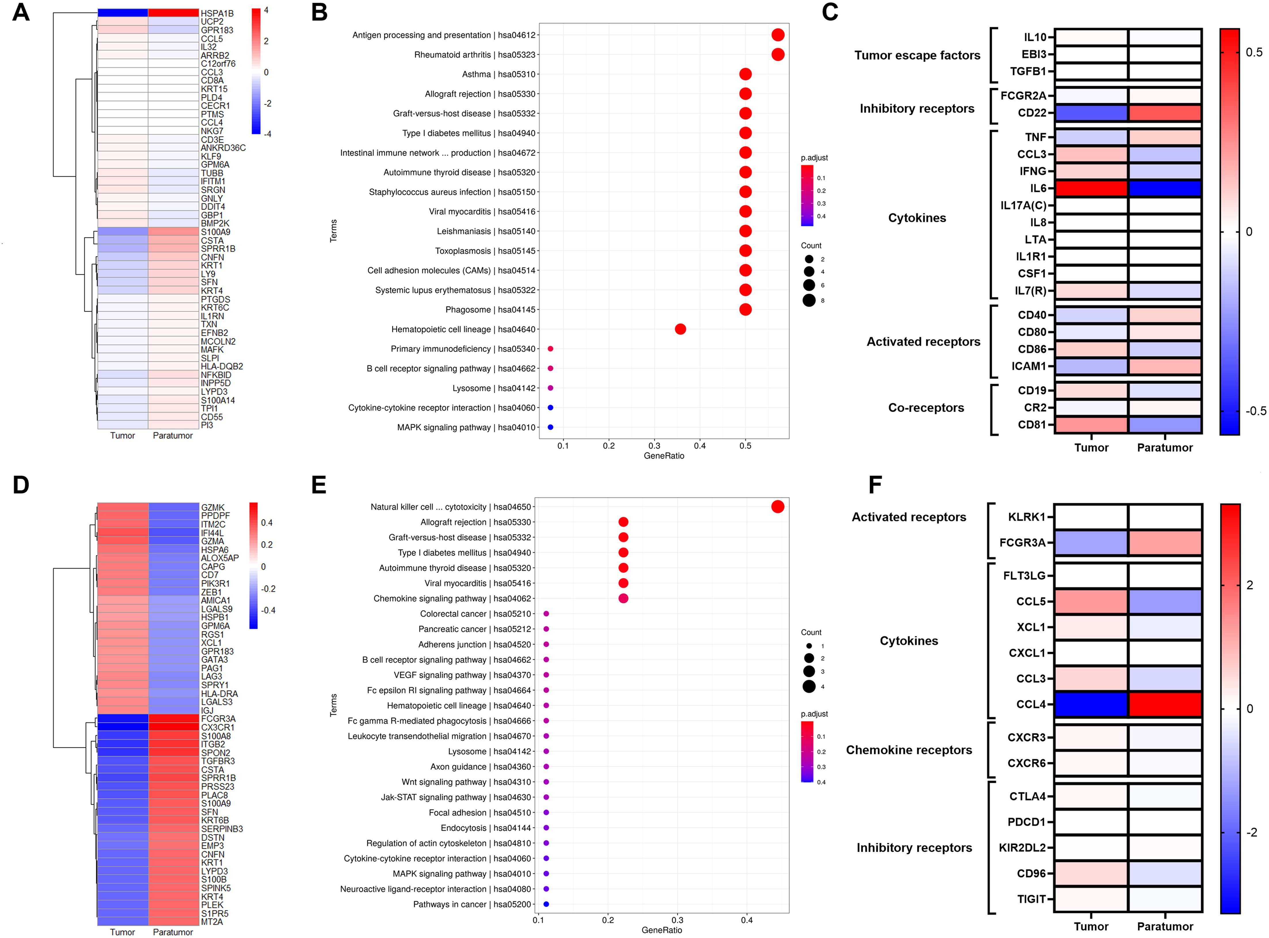 Figure 5. Gene Signatures of B Cells and NK/T Cells in Cervical Squamous Cell Carcinoma (CSCC). (A) Heatmap of the top 50 differentially expressed genes (DEGs)in B cells comparing tumor and paratumor tissues. (B) KEGG pathway analysis of B cell DEGs; circle size denotes gene count, color reflects adjusted p-value. (C) Comparison of functional molecule levels in B cells between tumor and paratumor tissues. (D) Heatmap showing the top 50 DEGs in NK/T cells between tumor and paratumor tissues. (E) KEGG pathway analysis of NK/T cell DEGs; circle size indicates gene number, color shows adjusted p-value. (F) Expression profiles of functional molecules in NK/T cells.