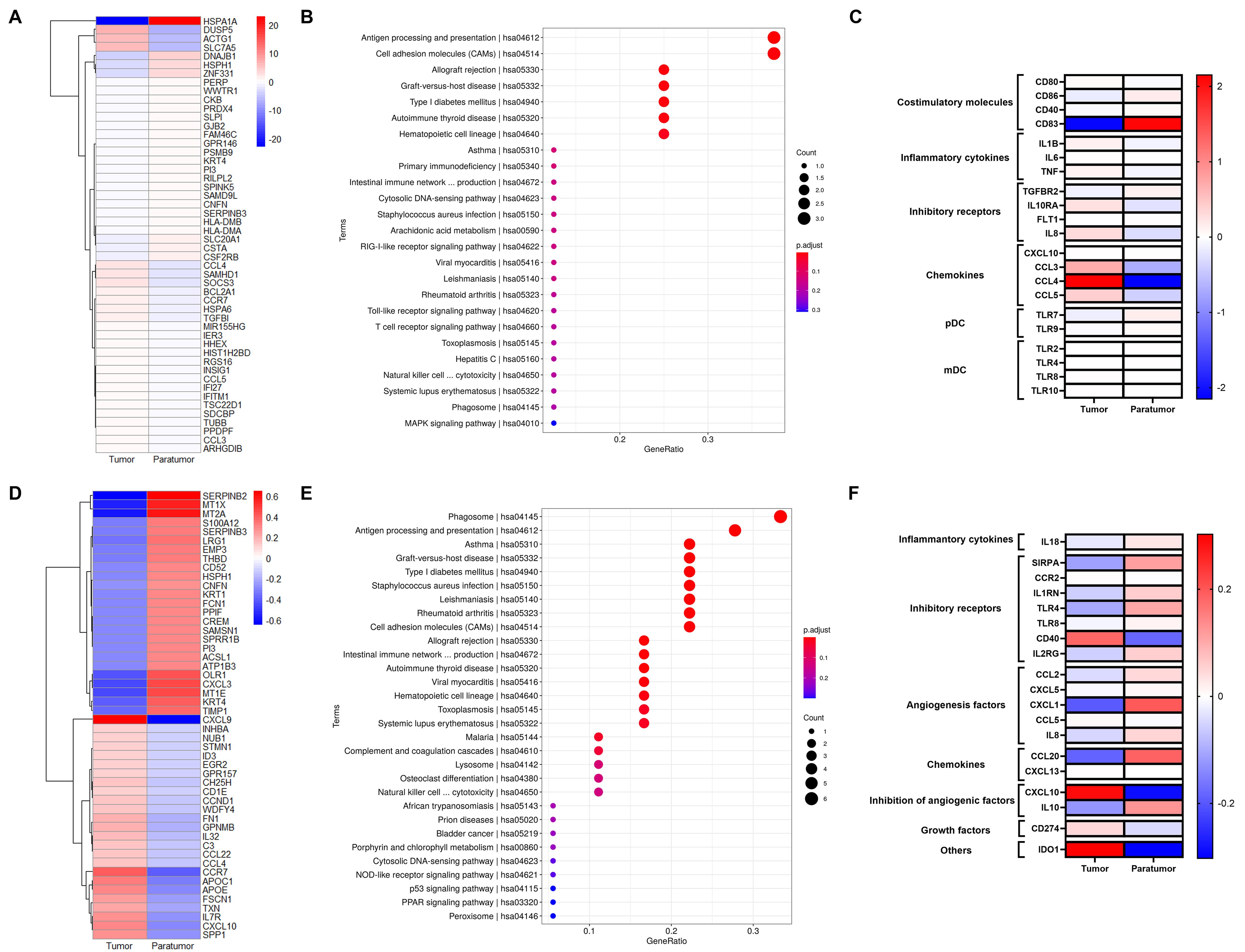 Figure 6. Gene Signatures of pDCs and Macrophages in Cervical Squamous Cell Carcinoma (CSCC). (A) Heatmap showing the top 50 differentially expressed genes (DEGs)in pDCs between tumor and paratumor tissues. (B) KEGG pathway analysis of pDC DEGs; circle size represents gene count, color indicates adjusted p-value. (C) Expression analysis of functional molecules in pDCs comparing tumor and paratumor tissues. (D) Heatmap of the top 50 DEGs in macrophages between tumor and paratumor tissues. (E) KEGG pathway analysis of macrophage DEGs; circle size denotes gene number, color reflects adjusted p-value. (F) Comparison of functional molecule expression in macrophages between tumor and paratumor tissues.