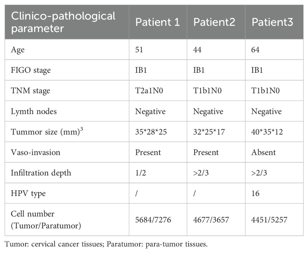 Fresh squamous cervical cancer specimens were collected from three patients undergoing primary surgery at the Department of Obstetrics and Gynecology, First Hospital of Jilin University, between June 2019 and August 2020. None received preoperative treatment. Patient and sample details are listed in Table 1. Ages ranged from 44 to 64 years, with grade 1, FIGO stage IB1 tumors, and no lymph node metastasis. Tumor and paratumor tissues were promptly harvested post-excision. Single-cell RNA sequencing (scRNA-seq) was performed on 14,812 tumor cells and 16,190 paratumor cells.