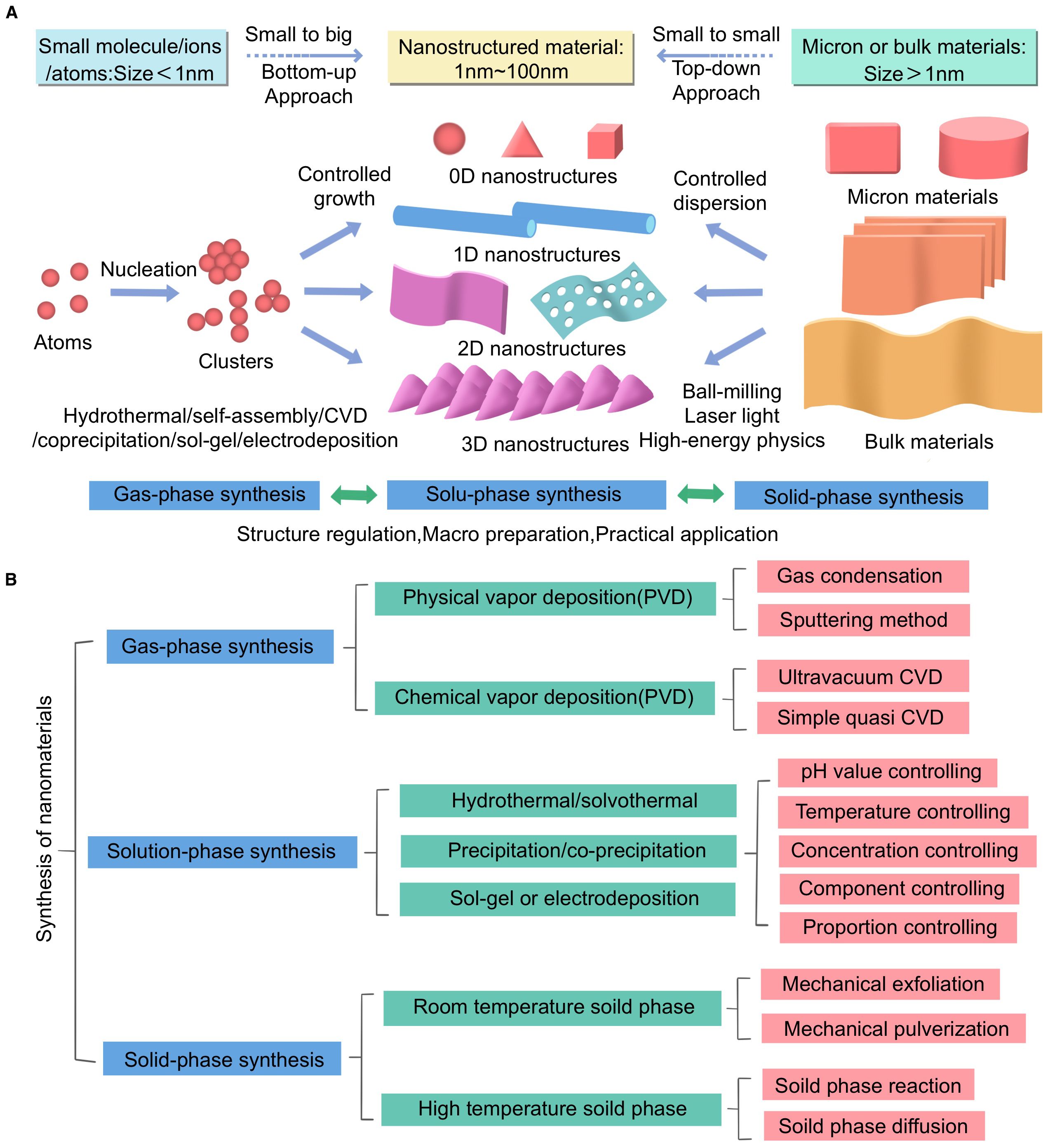 In Section A of Figure, two methods for synthesizing nanomaterials are presented: bottom up and top-down approaches. The bottom-up method starts with small molecules or atoms (size < 1 nm) and gradually constructs nanostructured materials (1 nm–100 nm) through controlled growth and nucleation processes. This method is closely related to techniques such as hydrothermal synthesis, sol gel synthesis, electroplating, and chemical vapor deposition (CVD). The top-down method, on the other hand, starts with micron sized or bulk materials (size > 1 μm) and reduces them to nanoscale materials through processes such as ball milling and laser processing.