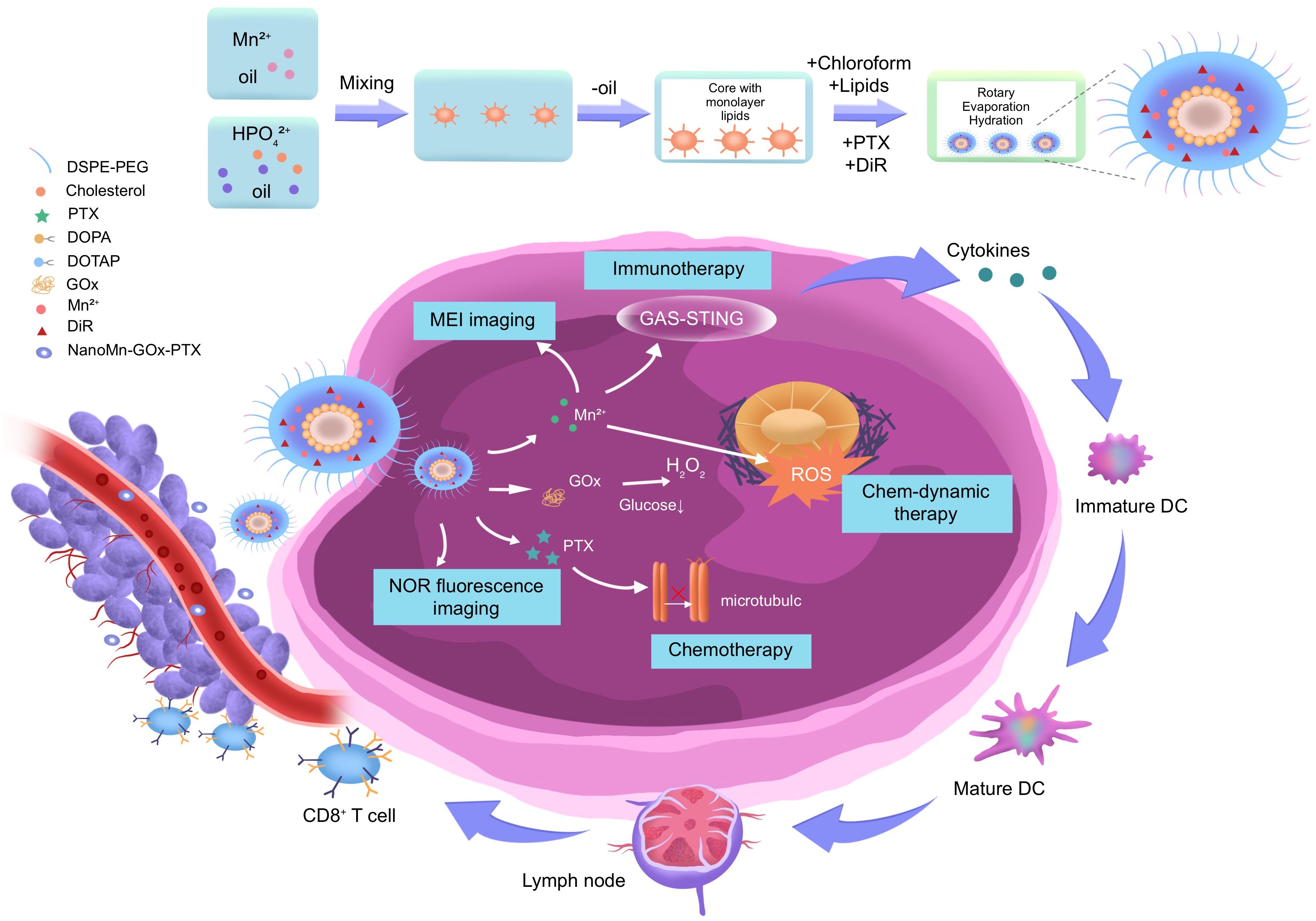 Another nanoplatform employs a DSPE-PEG lipid bilayer to encapsulate components such as manganese ions (Mn²+), glucose oxidase (GOx), paclitaxel (PTX), and the fluorescent dye DiR (57). While ensuring near perfect biocompatibility and circulatory stability, it can achieve controlled, precise release under tumor specific stimulation. Following systemic administration, the nanoparticle platform passively accumulates in tumor tissues via the enhanced permeability and retention (EPR) effect (58). Once localized in the tumor microenvironment (TME), the platform automatically responds to its unique biochemical conditions and external irradiation. Mechanistically, GOx catalyzes the oxidation of intratumoral-glucose to gluconic acid and hydrogen peroxide (H2O2), leading to two critical outcomes (59): (1) depletion of glucose disrupts tumor cell metabolism and promotes starvation induced apoptosis; (2) the generated H2O2 reacts with Mn²+ via a Fenton like reaction to yield highly cytotoxic hydroxyl radicals (•OH), which induce oxidative stress and cellular damage—constituting the CDT component (60).