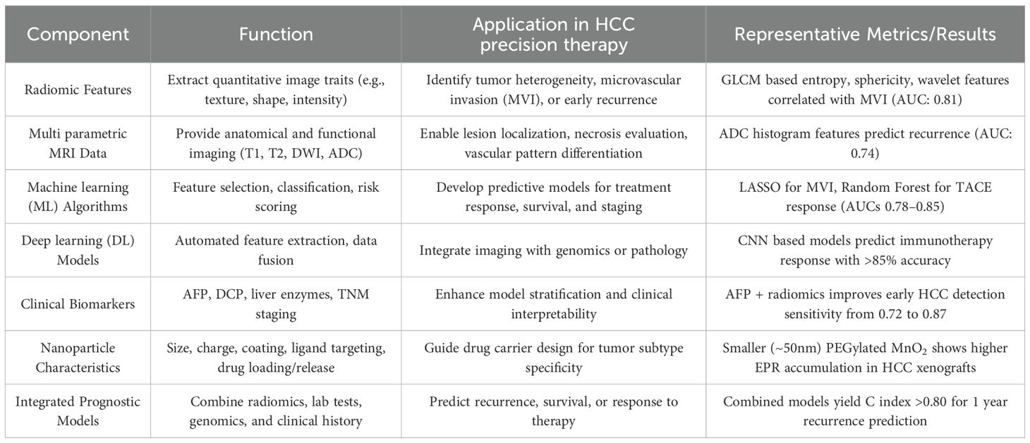 The integration of multimodal data analysis and radiomics provides key insights for precision treatment of HCC. Radiomics can systematically extract high dimensional quantitative features from MRI and other medical imaging data, capturing tumor heterogeneity, microstructural patterns, and spatial complexity that are not apparent to clinicians. When combined with clinical biomarkers, genomics, transcriptomics, and patient history, these features provide a robust, data driven framework for individualized clinical decision making (41).
