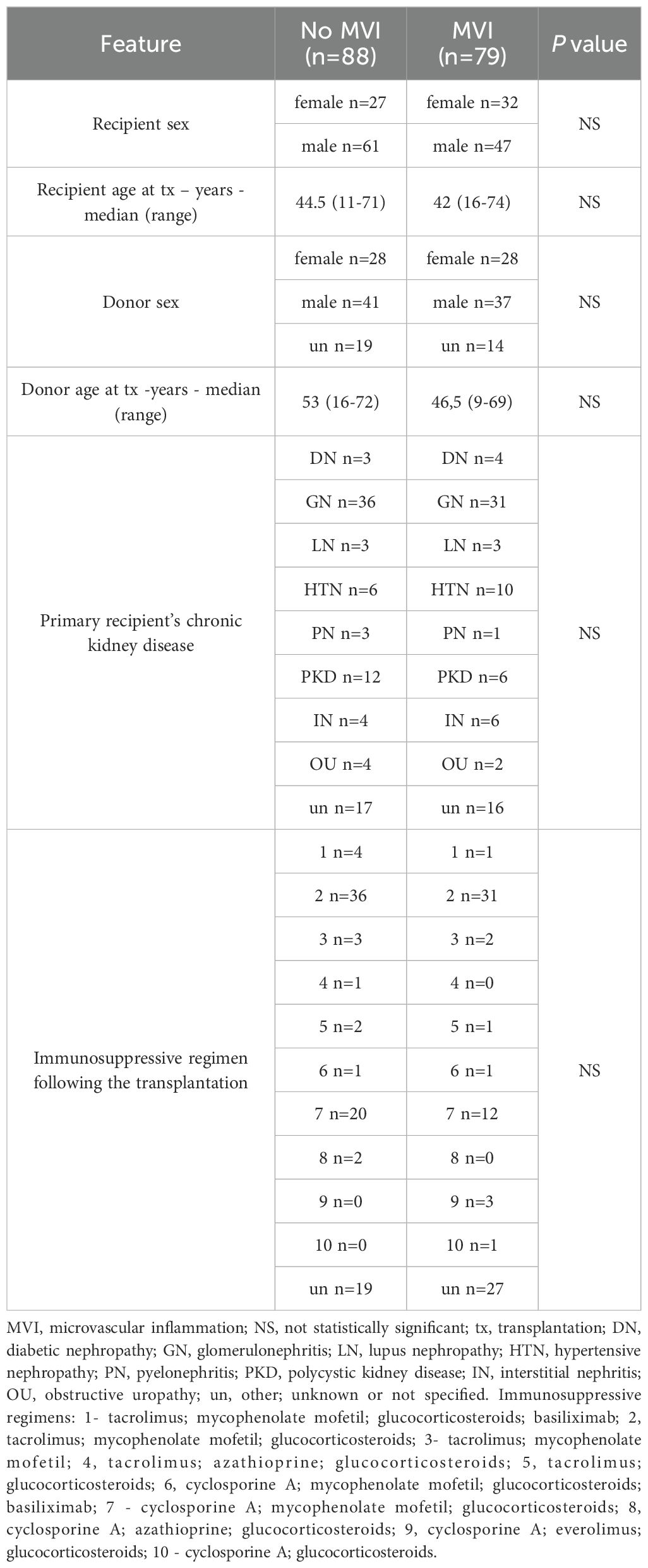 Following diagnostic criteria for MVI described in the preceding section, the study cohort comprised 88 patients without microvascular inflammation and 79 patients with microvascular inflammation. There were no statistically significant differences in sex distribution or mean recipient age between the two groups. Moreover, both the distribution of immunosuppressive protocols and the underlying causes of chronic kidney disease leading to transplantation were similar between the groups.