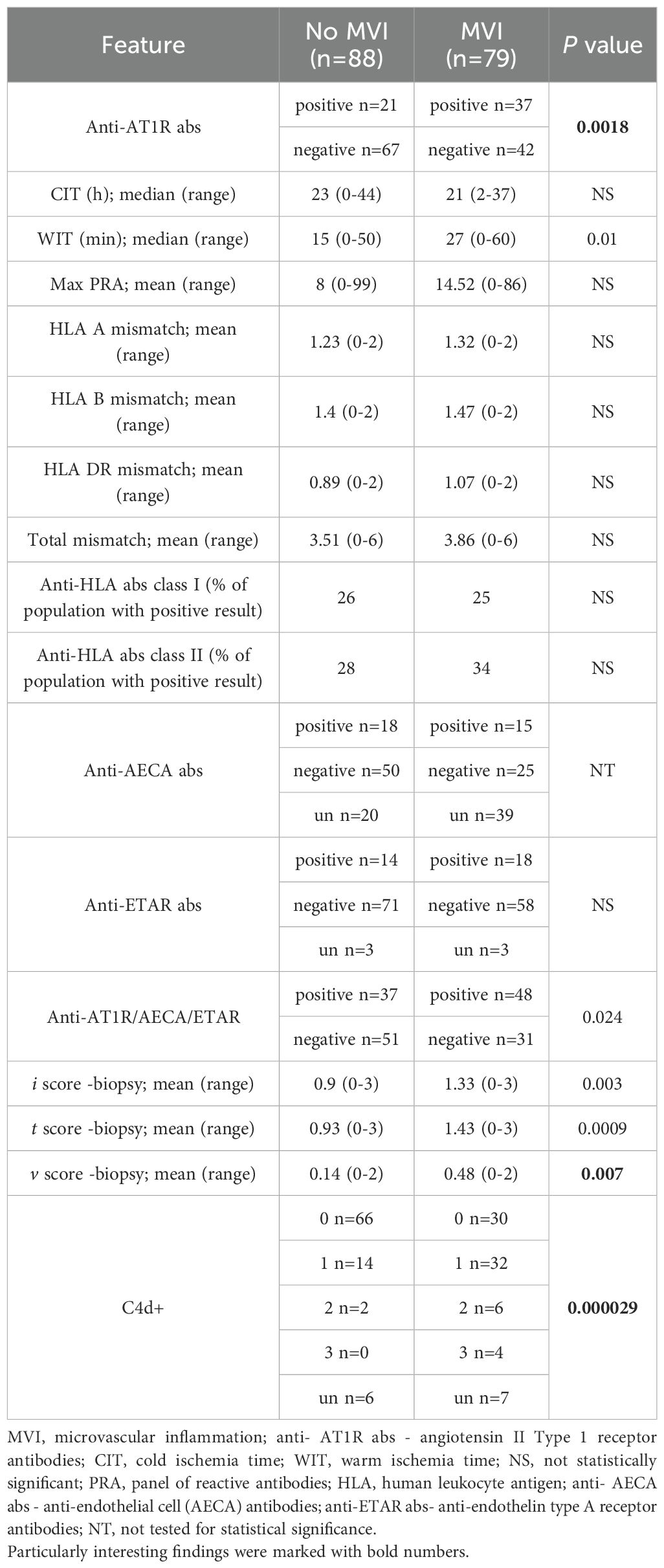 Material and methods: A retrospective analysis was performed on clinical and pathological data from 167 kidney transplant recipients. MVI was diagnosed histologically based on biopsy findings, specifically a glomerulitis score (g) > 0 and/or peritubular capillaritis (ptc) > 0. Based on these criteria, two patient cohorts were identified: 88 patients without MVI and 79 patients with MVI. Statistical analyses were conducted using appropriate methods, including chi-square tests, Student’s t-tests, and Mann–Whitney U tests. Additionally, complementary analyses utilizing artificial intelligence techniques such as correlation analysis, logistic regression and association rule mining were applied to maximize insights from the dataset.