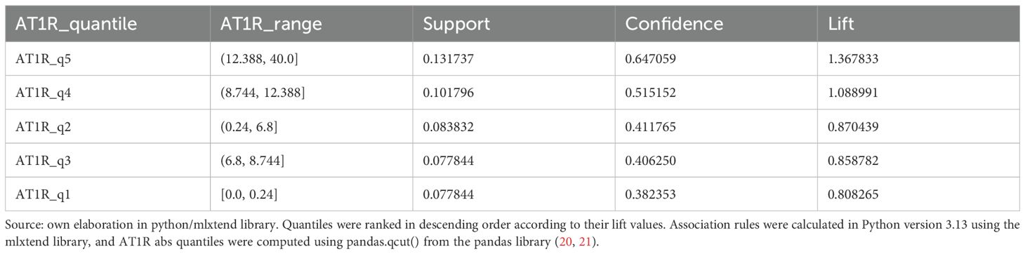 Association rules were calculated in Python version 3.13 using the mlxtend library, and AT1R abs quantiles were computed using pandas.qcut() from the pandas library (20, 21).