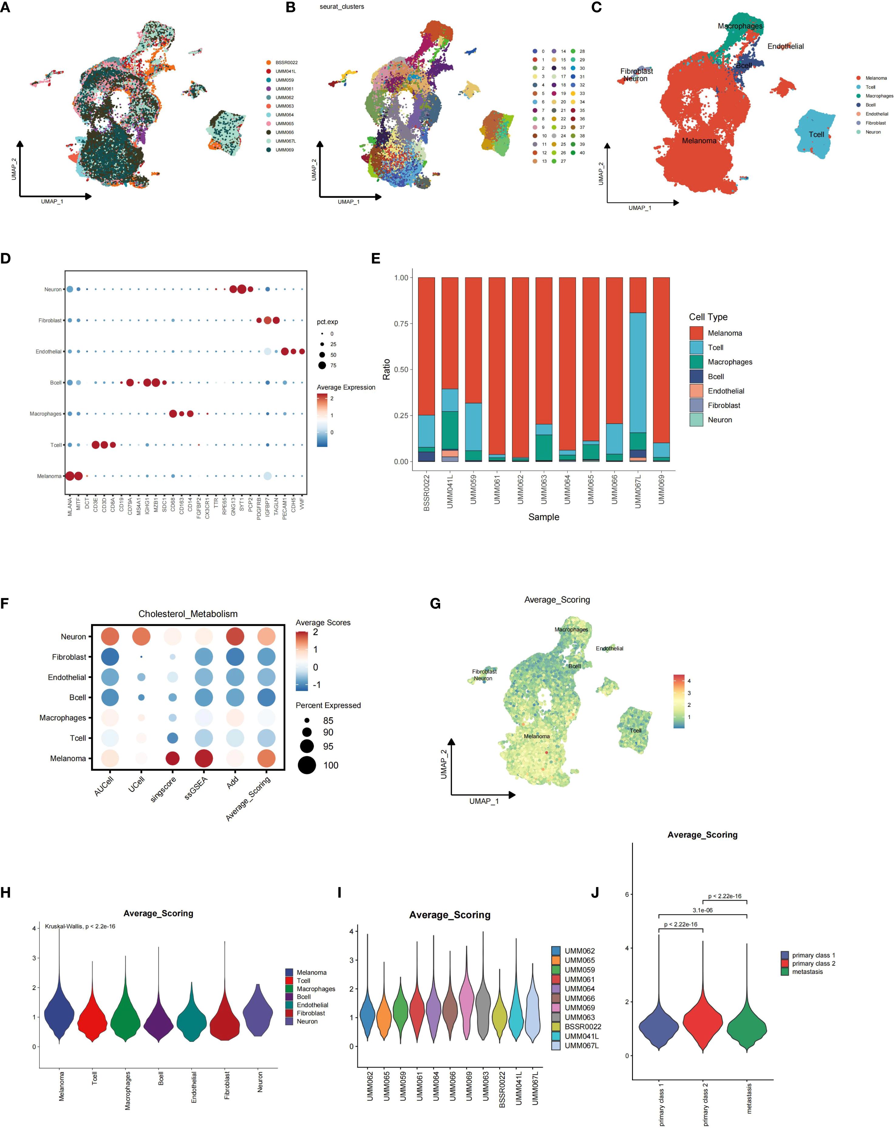 Figure 1. Integration of single-cell sequencing data from the GSE139829 dataset and single-cell data scoring for cholesterol metabolism using five different algorithms. (A) Batch effects between samples were eliminated using harmony algorithm. (B-D) Identification of distinct cell types, including melanoma cells, T cells, macrophages, B cells, endothelial cells, fibroblasts, and neural cells, based on their specific marker genes. (E) Proportion stack plot illustrating the relative abundance of different cell types across samples, highlighting a higher proportion of T cells in metastatic uveal melanoma samples (BSSR0022, UMM041L, and UMM067L) compared to primary samples (UMM062, UMM065, UMM059, UMM066, UMM061, UMM069, UMM064, and UMM063). (F) Dot-plot showing the Average scores across distinct cell types, with the color representing the scores and dot size showing the percentage cells with effective scoring. (G) Feature plot depicting cholesterol metabolism scores for each cell. (H) Violin plot showing the distribution of scores across major cell types. (I, J) Violin plots showing the distribution of cholesterol metabolism scores for melanoma cells across samples, with metastatic melanoma cells exhibiting lower scores.