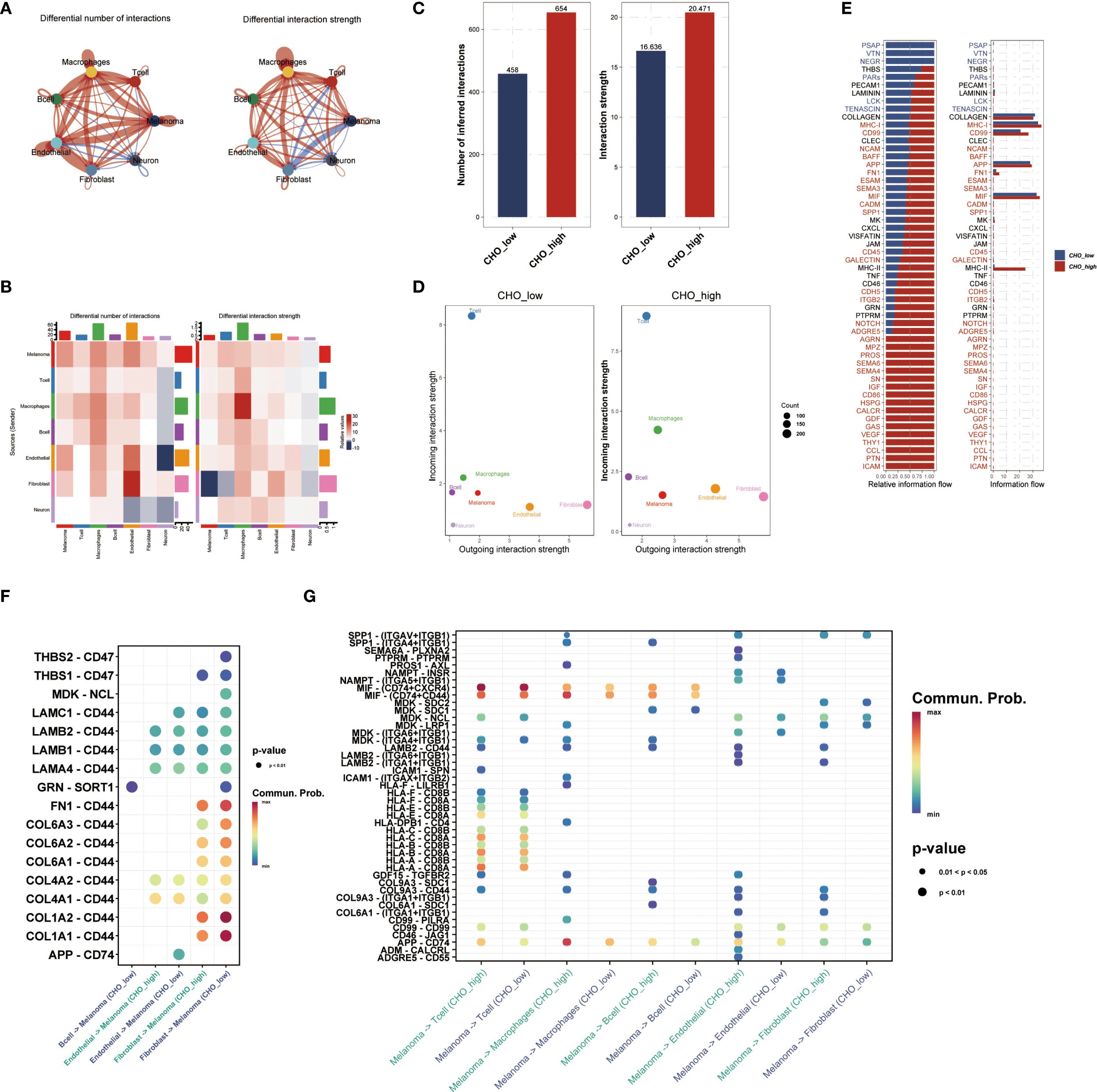 Figure 2. Cholesterol Metabolism is associated with Cell-Cell Communication in the UM Micro-environment. (A) Single-cell data were divided into Cho-high and Cho-low groups based on median cholesterol metabolism scores, followed by cell-cell communication analysis. (B) Analysis of communication strength based on specific cell types. (C, D) The Cho-high group showed higher communication numbers and intensity compared with the Cho-low group. (E) The bar plot showed the relative and actual information flow in single-cell data between the Cho-high and Cho-low groups. (F, G) Ligand-receptor interaction was quantified and visualized. In the Cho-high group, APP-CD74 outgoing communication was elevated, while the collagen-CD44 axis signal was higher in the Cho-low group.