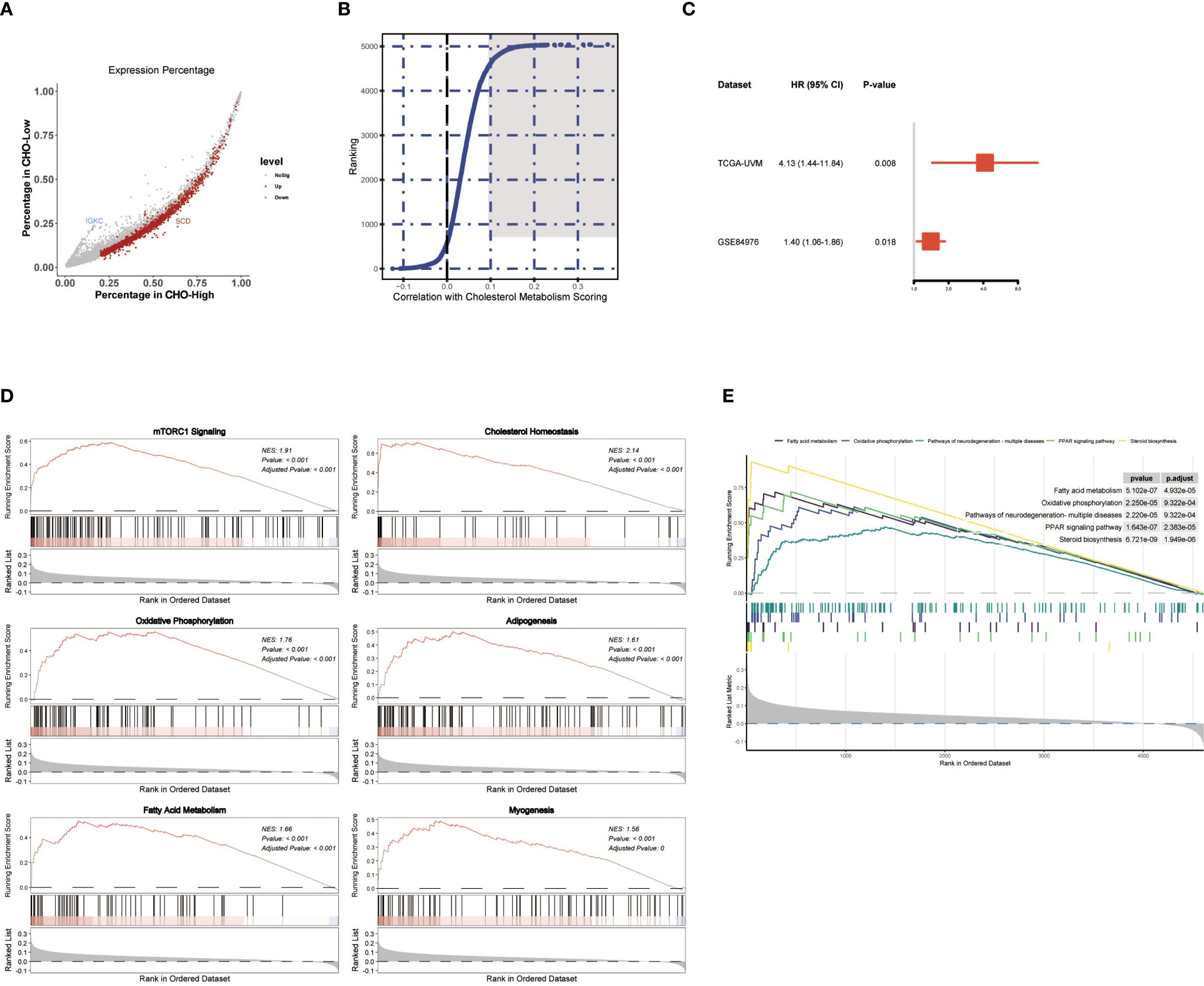 Figure 3. Identification of Cholesterol Metabolism Related Genes SLC45A2 Correlated to UM Prognosis. (A) Scatter plot showing genes with logFC>2 and P value<10–5 and expressed in more than 20 percent of melanoma cells in either of the two categories. (B) Correlation analysis for genes with average cholesterol metabolism scores in melanoma cells single-cell dataset GSE139829. The top 500 genes were marked in dark grey (Figure 4B). (C) Forest plot showing the Cox regression results of SLC45A2. SLC45A2 was correlated to overall survival in both the TCGA-UVM dataset and the GSE84976. (D, E) GSEA analysis was conducted after correlation analysis for all genes with average cholesterol metabolism scores in melanoma cells.
