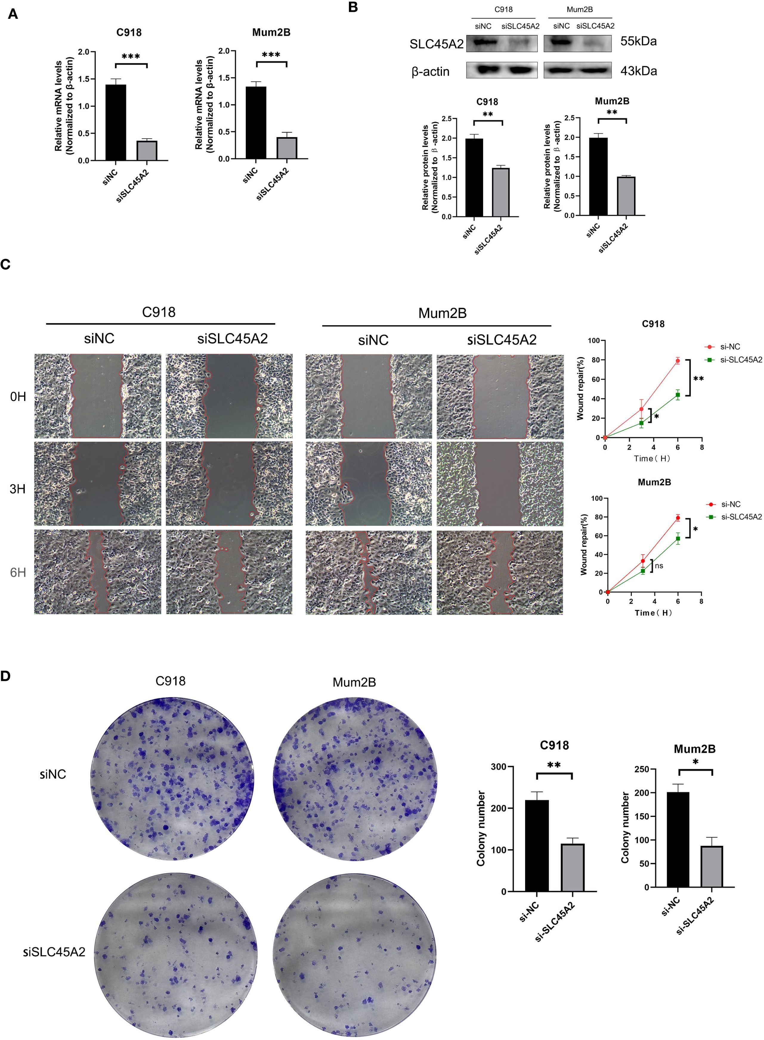 To verify the effect of SLC45A2 on the function of human uveal melanoma cell line C918 and MuM2B, we first validated the knockdown efficiency of SLC45A2 in the C918 and MuM2B cell lines by analyzing the expression level of SLC45A2 mRNA via qRT-PCR (Figure 4A) and the representative expression of SLC44A2 protein via Western blot (Figure 4B). The cells were transfected with siRNA targeting SLC45A2 or a non-targeting control siRNA (siNC). Compared with the siNC group, the mRNA and protein levels in the siRNA treatment groups were significantly reduced (Figure 4A, B, p < 0.05). The wound healing assay indicated impaired cell migration. Differential interference contrast microscopy images at 0 h and 3 h, and 6 h after scratching. Compared with the control cells (siNC group), the wound closure ability of the cells with SLC45A2 knockdown (siSLC45A2 group) was significantly reduced, indicating that their migration ability was inhibited (Figure 4C). The clone formation survival rate was evaluated by crystal violet staining. Compared with siNC, knockdown of SLC45A2 significantly reduced the number and size of cell colonies, confirming that SLC45A2 plays a key role in maintaining the proliferation potential (Figure 4D).