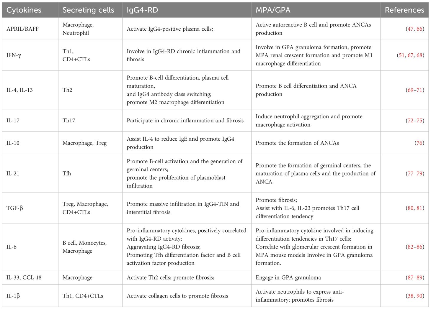 Monocytes, as part of innate immunity, play critical roles in defending against pathogens, phagocytosing apoptotic cells, producing ROS, and presenting antigens (146).In IgG4-RD, monocytes secrete TGF-β and IL-1β, promoting fibrosis in affected tissues (147). In AAV, ANCAs activate monocytes to produce pro-inflammatory cytokines such as IL-1β, TNF-α, and IL-6, which, in turn, activate neutrophils (148) and contribute to tubulointerstitial injury (149). In IgG4-RD, IL-1β also produced by CD4+ CTLs, high IL-1β may exacerbate MPA/GPA by activating neutrophils. When peripheral blood mononuclear cells are stimulated with PR3 or MPO, it results in an elevated production of IL-6 (150), This heightened IL-6 level subsequently promotes fibroblast proliferation as well as the synthesis of collagen and fibronectin, thereby worsening fibrosis in the tissues affected by IgG4-RD (82). Additionally, IL-6 can stimulate the production of Tfh differentiation factors and B cell activating factors in IgG4-RD, thereby promoting Tfh cell differentiation and B cell antibody production (82). In overlap syndromes involving IgG4-RD and MPA/GPA, monocyte proliferation releases various inflammatory cytokines, promoting vasculitis and fibrosis in affected tissues.