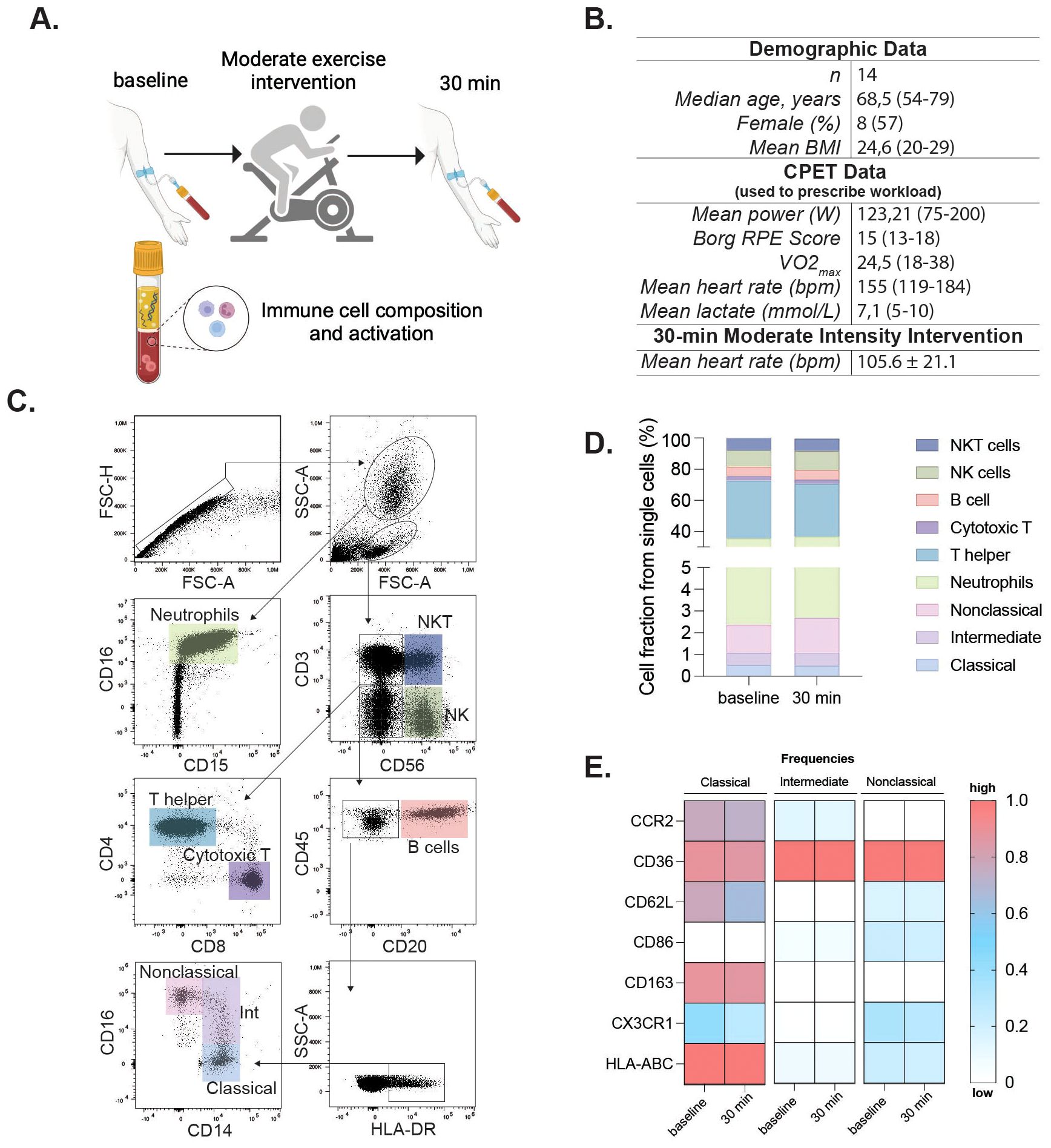 Figure 1. Moderate exercise alters immune activation in older adults. Clinical and experimental study design and analytical processes for the moderate exercise intervention. Participants completed a cycling cardiopulmonary exercise testing (CPET) for 30 minutes; peripheral blood was assessed at baseline and 30 min after the intervention (A). Demographic and exercise data for participants in the moderate intervention. VO2max and performance parameters (mean power, RPE, peak heart rate, and peak lactate) were obtained during the cardiopulmonary exercise test (CPET) used to prescribe the 60% VO2max workload for the 30-min cycling intervention. Mean heart rate (105.6 ± 21.1 bpm) reflects values recorded during the 30-min moderate-intensity intervention itself. (B). Flow cytometry gating identified single cells, granulocytes, and mononuclear cells via FSC/SSC. Neutrophils were further gated by co-expression of CD16/CD15. Mononuclear cells were gated on CD3 and CD56 to define NKT (CD3+CD56+) and NK (CD3-CD56+) cells. CD3-CD56- cells were assessed for CD20 (B cells), and CD20- cells further gated by CD14 and CD16 for classical (CD14+CD16-), intermediate (CD14+CD16low), and nonclassical (CD14lowCD16++) monocytes (C). Immune cell fractions are shown in bar charts (D). Heatmaps showing frequencies of activation marker-positive cells within classical, intermediate, and nonclassical monocyte subsets at baseline and 30min post-exercise. Rows represent markers, columns represent timepoints and subsets. Colors indicate relative frequency (red = higher, blue = lower) (E). Statistical significance was assessed using non-parametric tests. Panel (A) was created in BioRender (Garza, AP. 2024, https://BioRender.com/o96f904).
