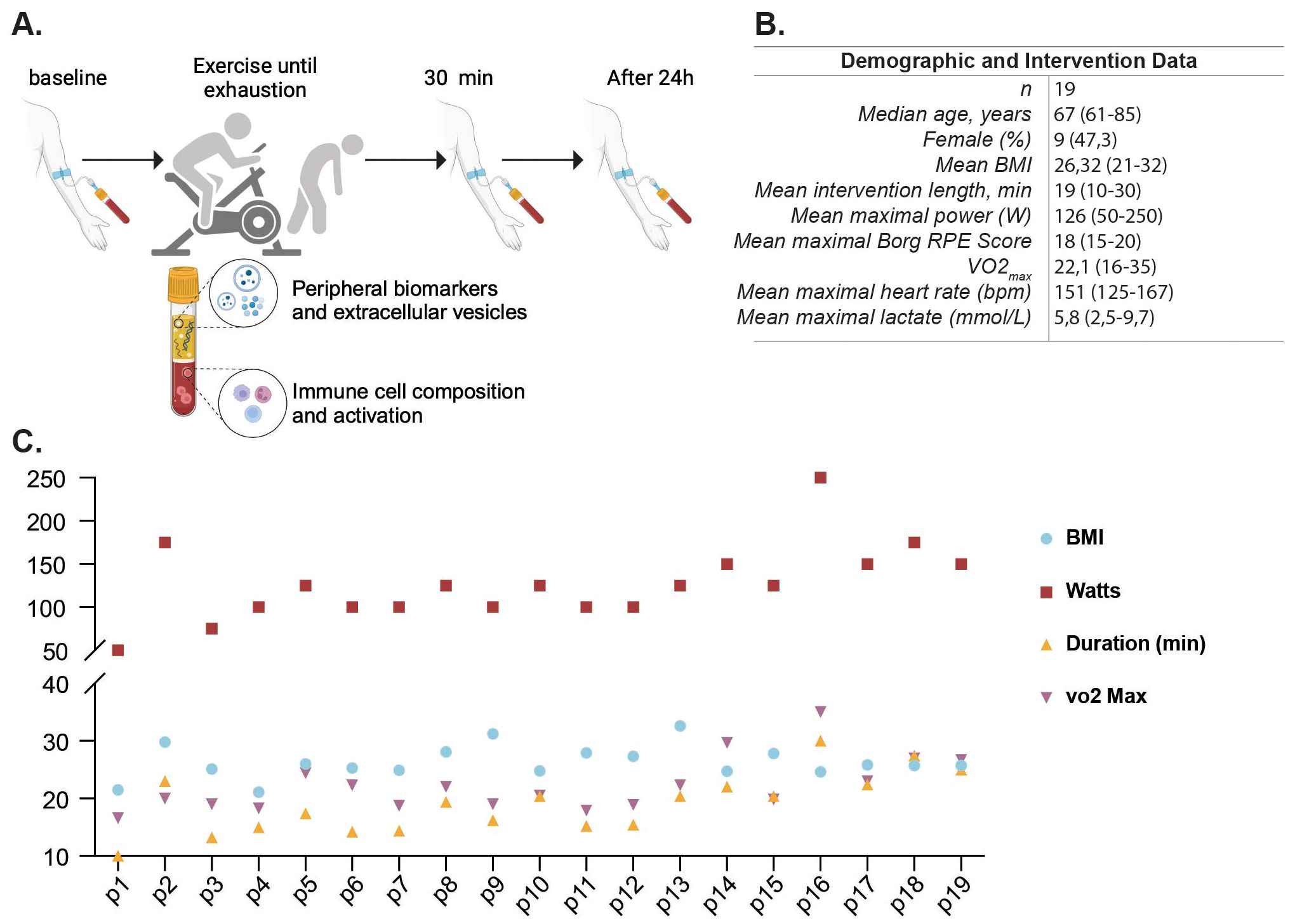To evaluate the effects of an acute high intensity exercise session, 19 healthy participants, with a median age of 67 years and a near-equal distribution of sex (47.3% females), underwent a maximum-intensity cardiopulmonary exercise test (CPET). The acute high-intensive exercise intervention was designed to push participants to their physical limits, enabling the assessment of immune responses and extracellular vesicle release under maximal stress conditions (Figure 2A). Participants exhibited a mean BMI of 24.6 and a mean power output of 126 Watts (ranging from 50-250W) during the intervention, which displayed substantial inter-individual variability (Figure 2B). The exercise duration and VO2max displayed notable similarities among participants, revealing the diverse fitness levels within the cohort (Figure 2C). All participants performed the same CPET protocol.