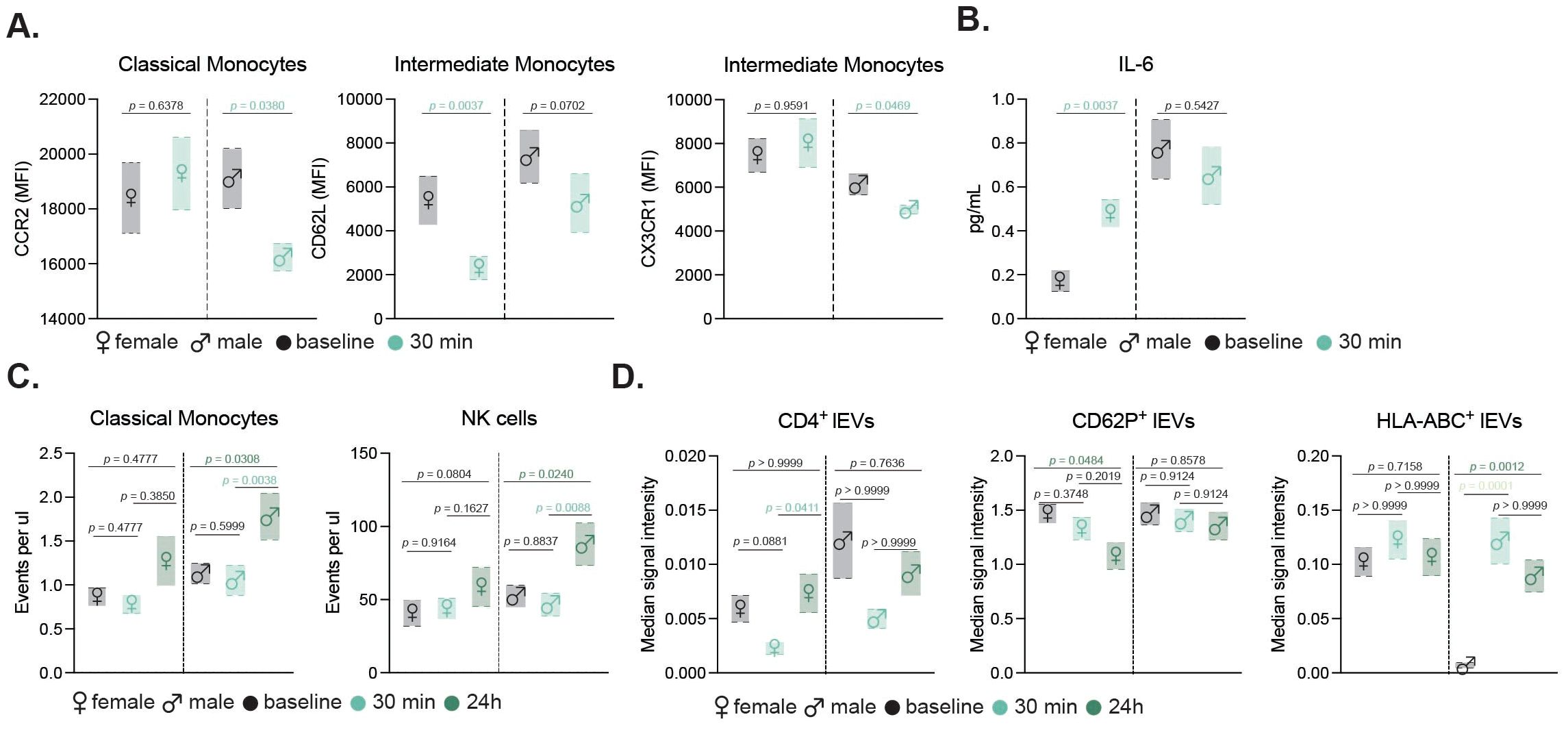 Figure 3. Sex-specific immune and EV responses to exercise in older adults. Floating bar charts showing sex-disaggregated mean ± SEM for monocyte activation markers (A) and IL-6 levels (B) before and 30 min after moderate exercise. Sex-specific counts of classical monocytes and NK cells (C), and median signal intensity of CD4+, CD62P+, and HLA-ABC+ EVs at baseline, 30 min, and 24 h post-intense exercise (D). Female and male data are shown with respective symbols (♀ left, ♂ right). Statistical tests included non-parametric t-tests (moderate, n=14) and mixed-effects analysis with Geisser-Greenhouse correction and Tukey’s test (intense, n=19). p values are indicated in the figure.