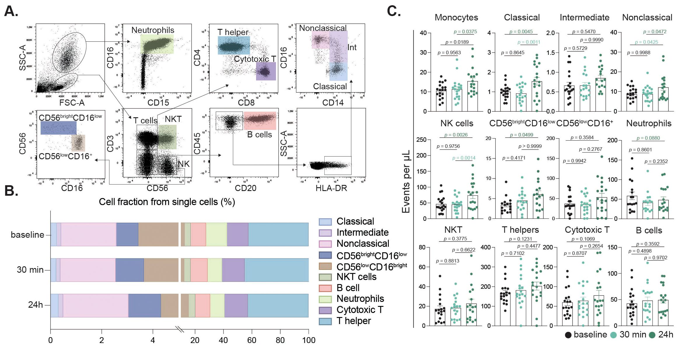 Figure 4. Peripheral immune cell subset alterations induced by intense exercise. Flow cytometry gating identified singlets, granulocytes, and mononuclear cells based on SSC/FSC. Neutrophils were gated by CD16/CD15 expression. Mononuclear cells were defined by CD3/CD56 to distinguish NKT (CD3+CD56+) and NK (CD3-CD56+) cells. NK cells were further subdivided into CD56brightCD16low/CD56lowCD16+ subsets. CD3-CD56- cells were assessed for CD20 (B cells); CD20- cells were gated on CD14/CD16 for classical (CD14+CD16-), intermediate (CD14+CD16low), and nonclassical (CD14lowCD16++) monocytes (A). Immune cell fractions relative to total single cells at baseline, 30 min, and 24 h post-exercise are shown (B). Bar charts showing cell fractions of immune cell populations at baseline (black), 30 min (turquoise) and 24 h (dark green) after the intervention (C).