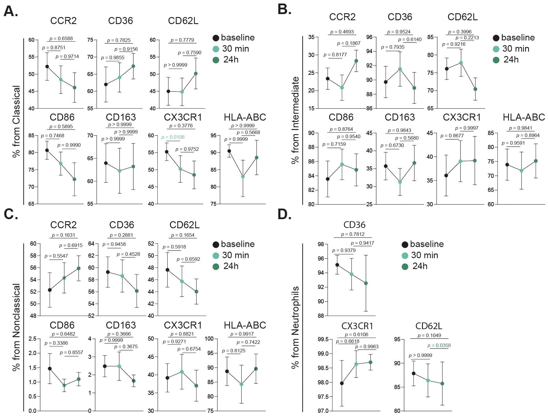 Monocyte and neutrophil activation after acute intense exercise was investigated to determine if their activation status was influenced by the intervention. The expression levels of key activation markers including CCR2, CD36, CD62L, CD86, CD163, CX3CR1, and HLA-ABC were evaluated across each monocyte subset. In classical monocytes (Figure 5A), CX3CR1 expression was significantly reduced 30 min post intervention. In contrast, intermediate (Figure 5B) and nonclassical (Figure 5C) monocytes did not exhibit significant changes in the studied markers. For neutrophils, a significant decrease in CD62L expression was observed between the 30 min and 24 h time points (Figure 5D).